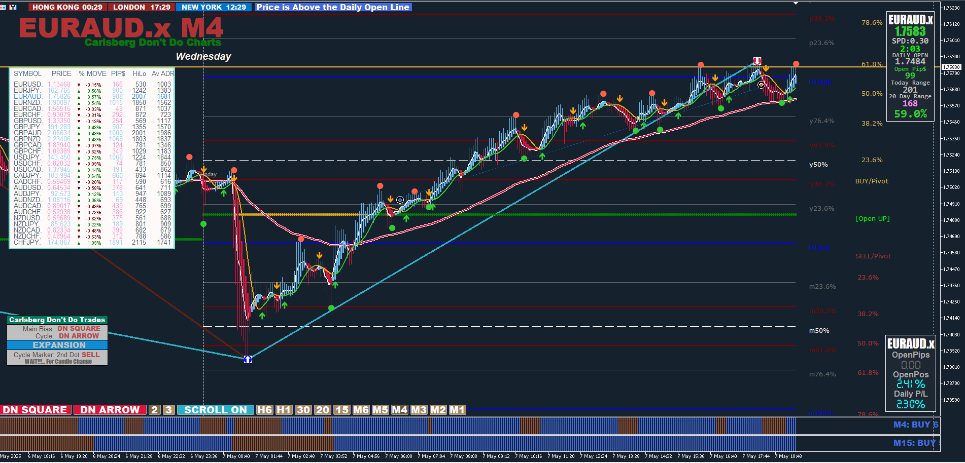 Example: In the screenshot, M4 for both ETHUSD and BTCUSD shows "DN SQUARE & DN ARROW", indicating a pullback within the H1/M20 bullish trend, presenting a buying opportunity.