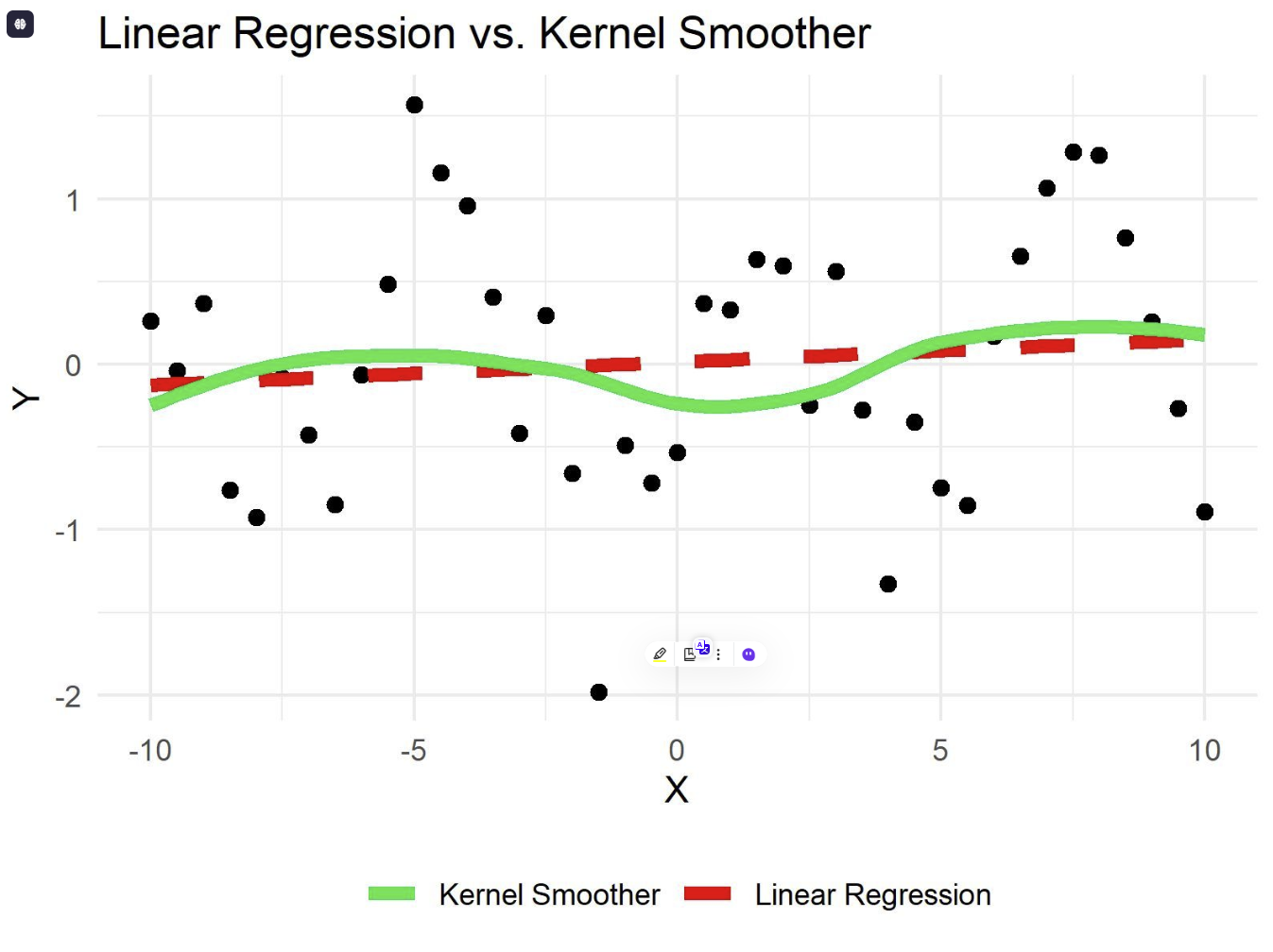 The visualization above shows the difference between linear regression (dashed red line) and kernel smoothing (solid green line). The kernel smoothing line adjusts to the data's natural curvature, providing a better fit for non-linear relationships.