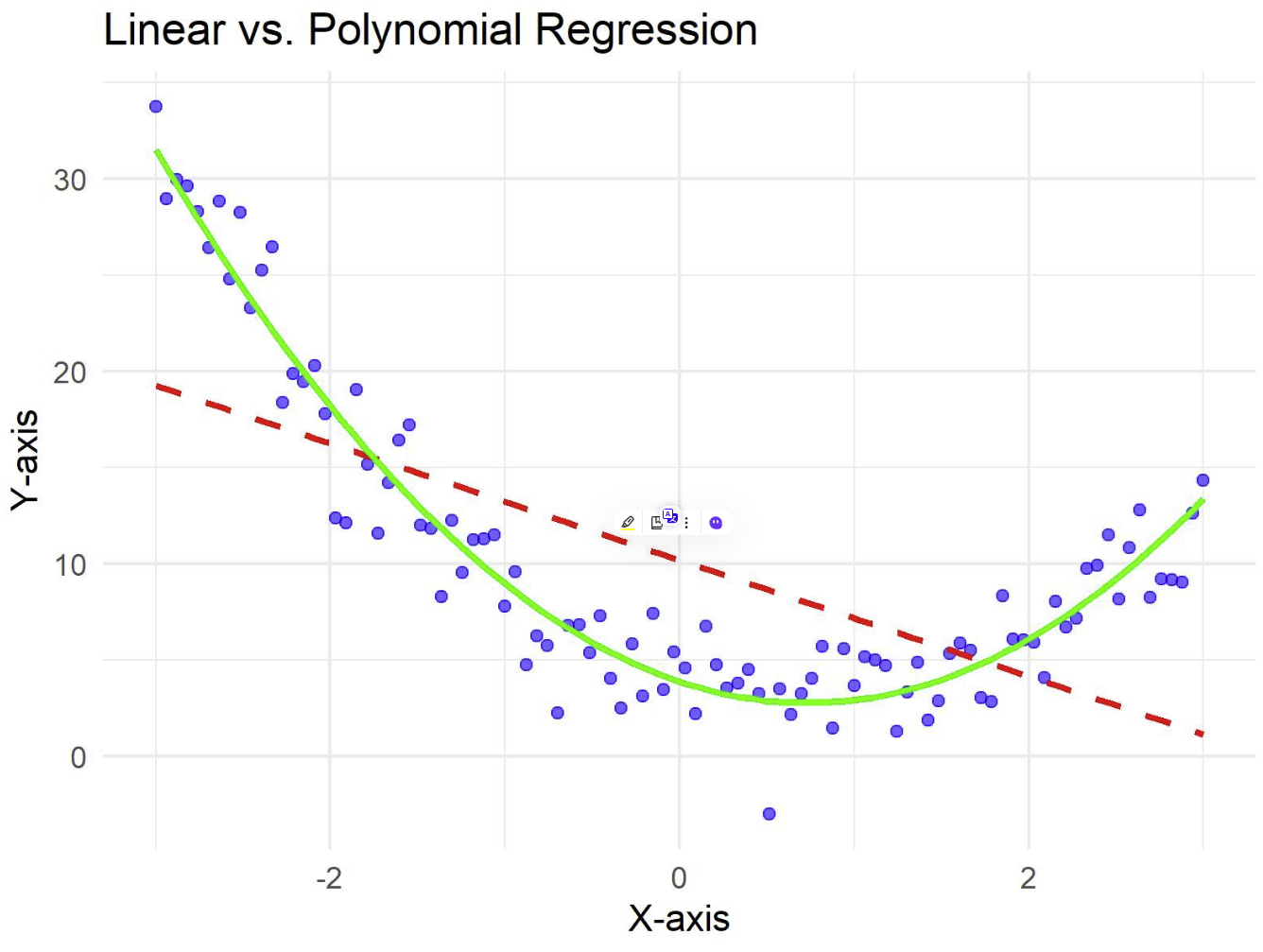 Transformed Features: Instead of treating the data as simple inputs, polynomial regression transforms the original input features (e.g., turning an input into its squared or cubic form). However, the relationship between the coefficients and the target variable remains linear.