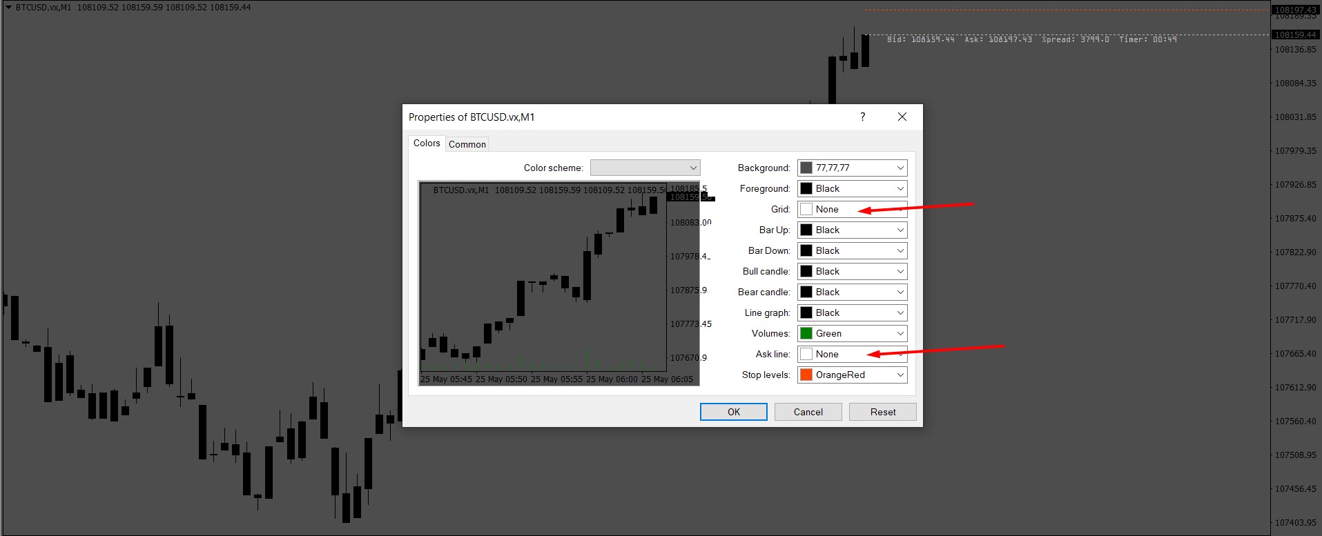 1.Open properties and select NONE for grid and ask line color