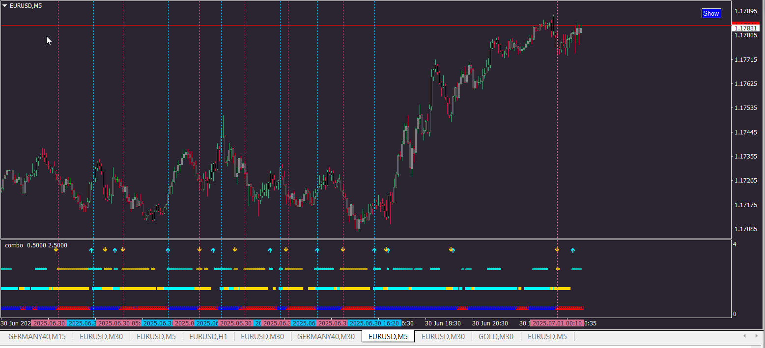 Here is version with vertical lineskvak wrote: Mon Jun 30, 2025 7:15 am Combo X: RSI + MoM + DeMarker + Force Index + MACD & ADX System