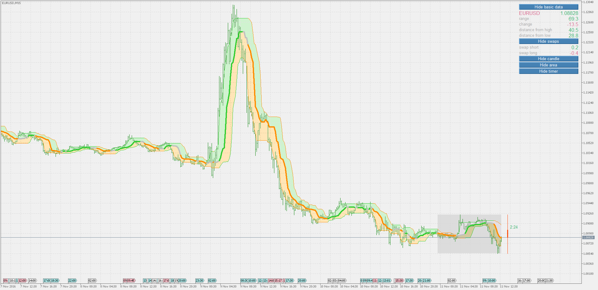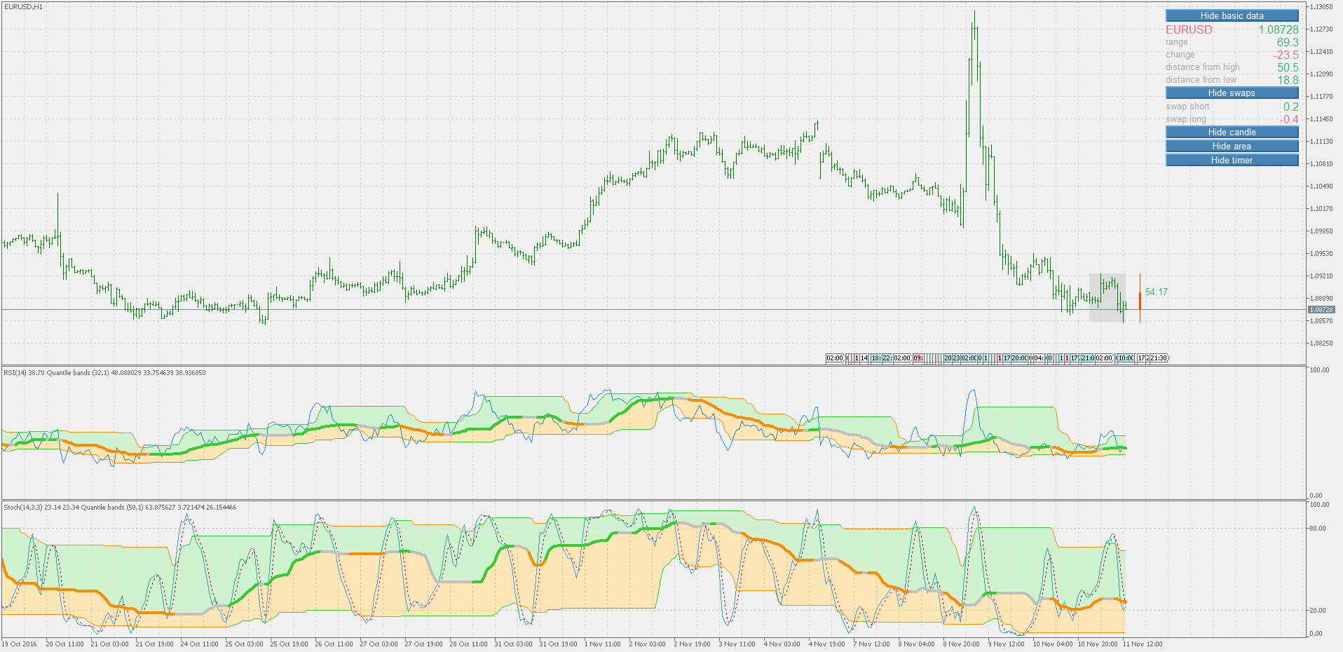 All the "bands" version of quantile bands are using 3 prices. This version is not. It is suing only one price, and for having an option to make a (substantial) difference between high and low, you can chose the period for finding out high and low value(s), But even without that (when the high/low period is set to <=1) the bands calculation itself does the job OK, and in most of the cases there is no need at all to have high/low period activated at all. Here is such an example