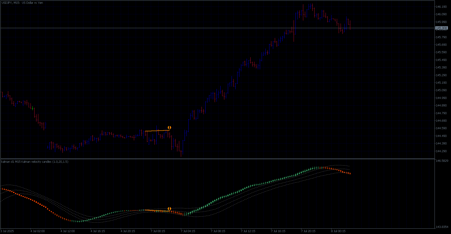 Kalman velocity candles (subwindow) with Keltner channels + MTF & Divergences for MT5