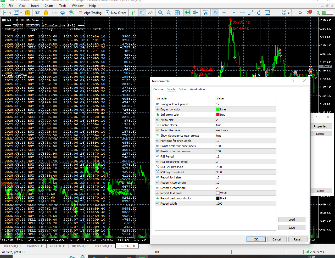 To test its performance, the last 60 BTC trades were analyzed, covering a price movement from 101,583 to 122,723 between May 12, 2025, and July 14, 2025. The results indicate that the indicator performed reasonably well, maintaining effectiveness throughout this period.