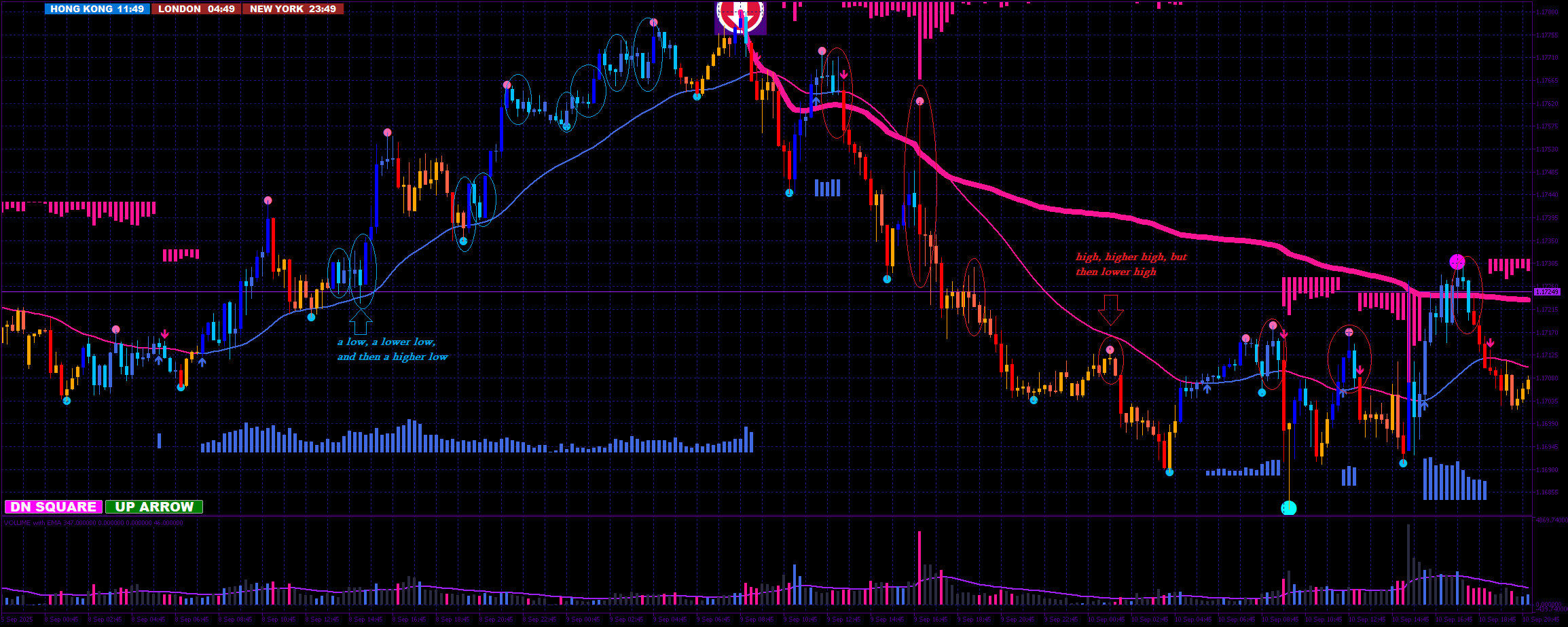 There are 3 types of this pattern, the sell example with the red arrow is his favorite one: a directional candle, then a small candle (indecision), and then a directional candle in the opposite direction (with at least 70% the size of candle 1).