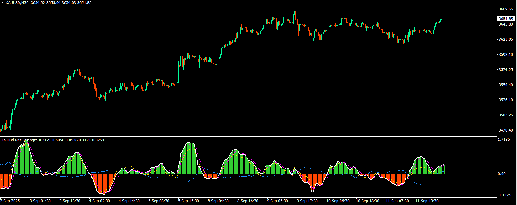 The XauUsd Net Strength indicator is a professional-grade market strength tool designed to track and compare the relative performance of Gold (XAU) against the U.S. Dollar (USD) across a diversified basket of currency pairs. Instead of relying on a single chart, it aggregates information from multiple gold- and dollar-based pairs, applies weighting factors, and translates the results into an easy-to-read strength comparison.