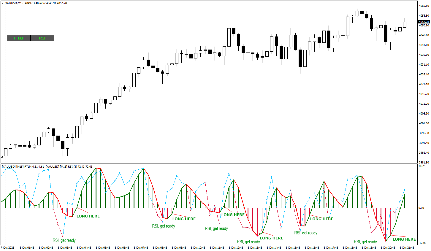 We use RSI (3) and FTLM (Fast Trend Line Momentum) indicators. M15 charts.