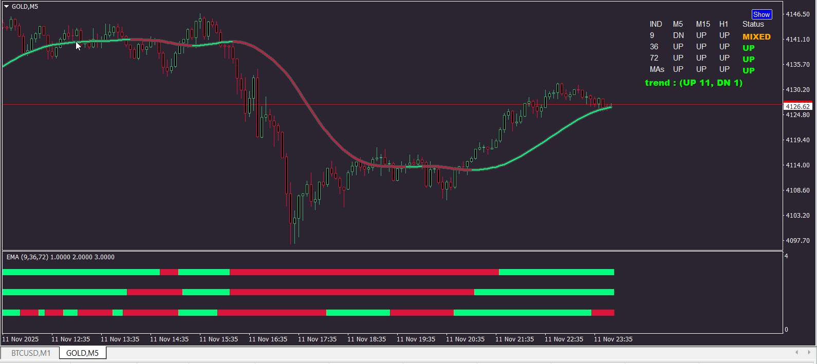 Here is small dashboard to control current and higher timeframe ( user choosable ) trend of two indicators what is used in this strategy.