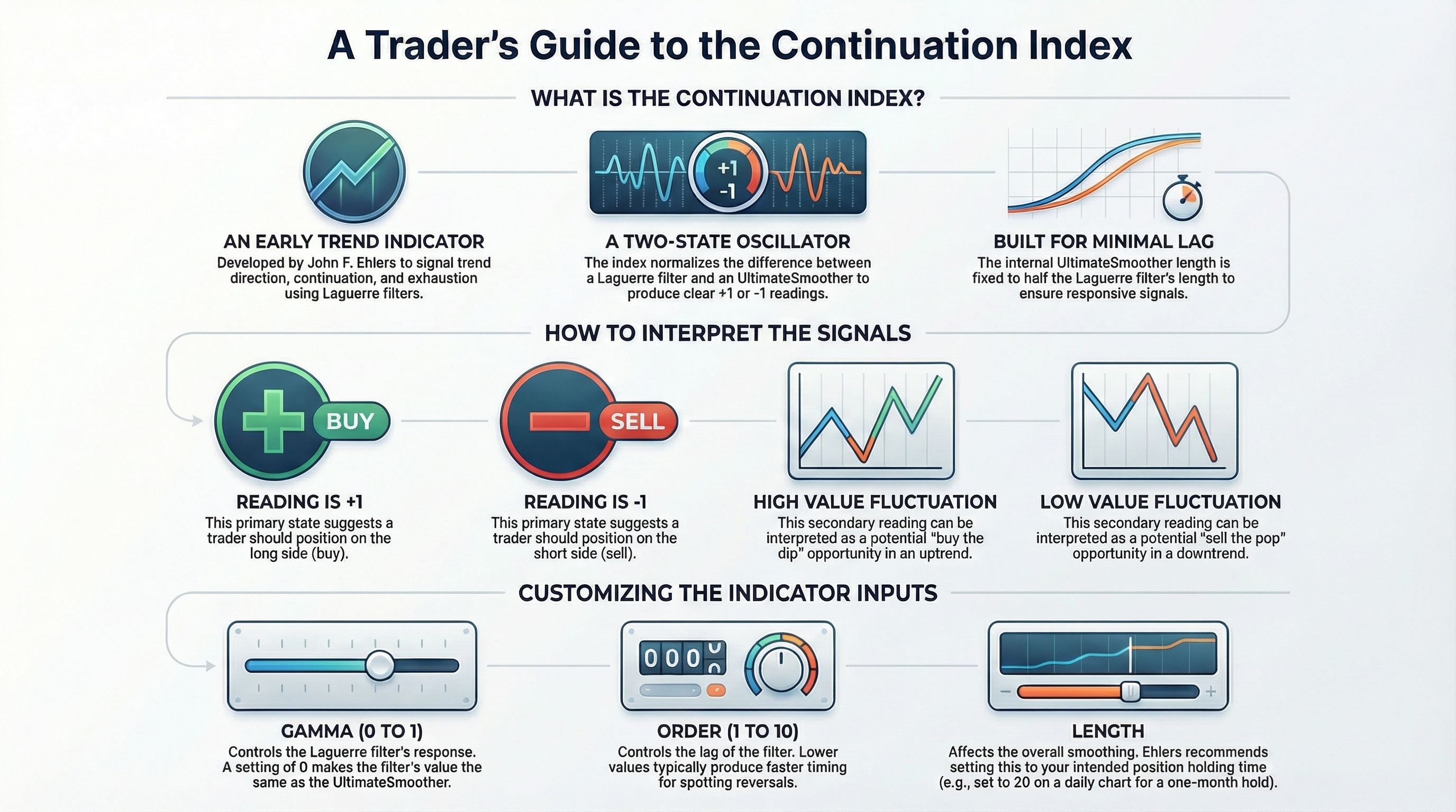 The idea for the Continuation Index was formed from an observation about Laguerre filters. In his article, Ehlers notes that when price is in trend, it tends to stay to one side of the filter. When considering smoothing, the UltimateSmoother was an obvious choice to reduce lag. With that in mind, The Continuation Index normalizes the difference between UltimateSmoother and the Laguerre filter to produce a two-state oscillator.