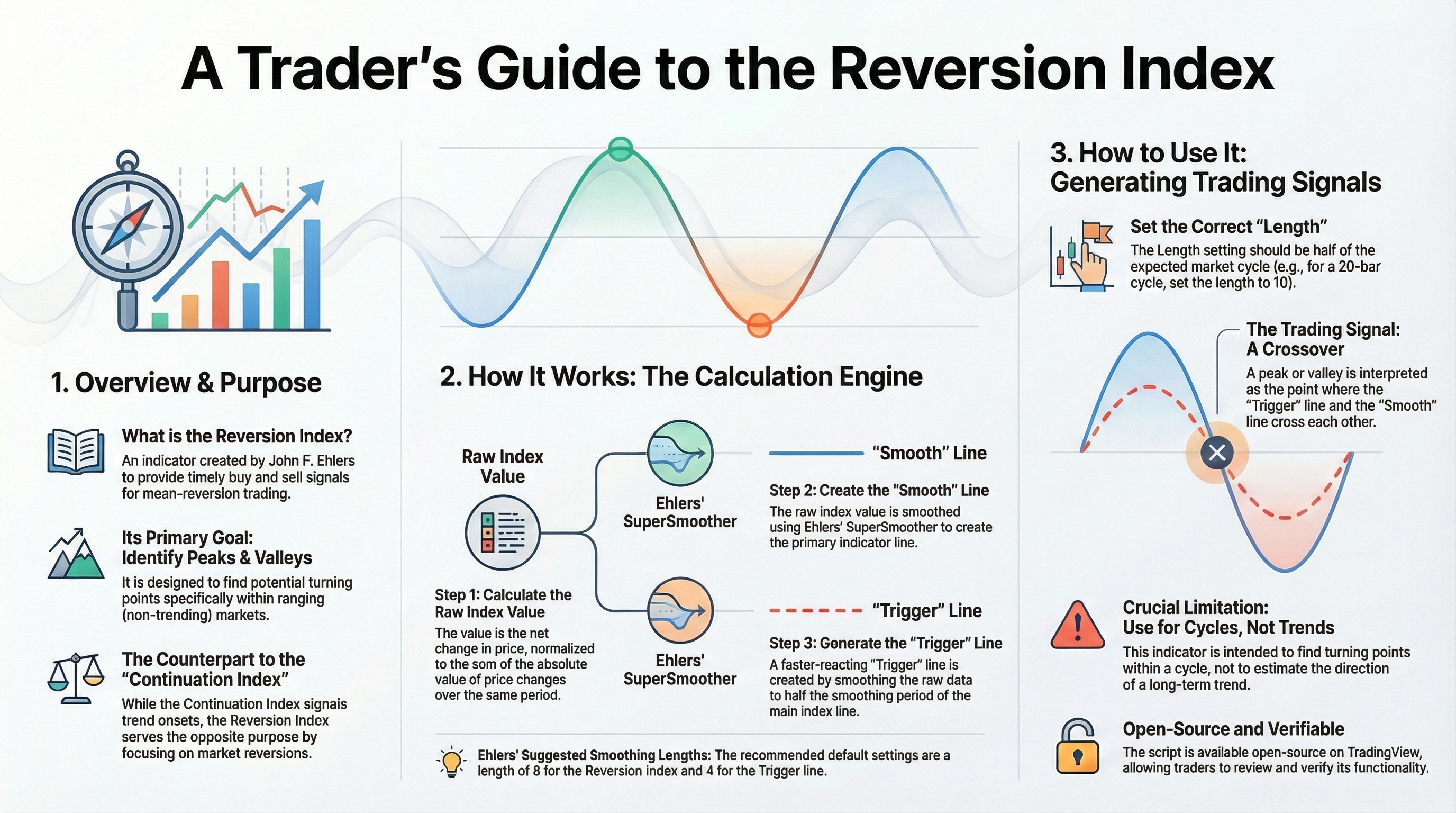 In John Ehlers’ article in this issue, “The Reversion Index,” he presents an indicator that produces timely buy and sell signals for mean-reversion strategies by summing bar-to-bar price changes and normalizing them by their absolute values. He explains that the summation should cover about half of the dominant cycle in the data, and that peaks and valleys are identified by the crossings of two SuperSmoother filters with different lengths. The reversion index is a normalized sum of price differences that oscillates between -1 and +1.