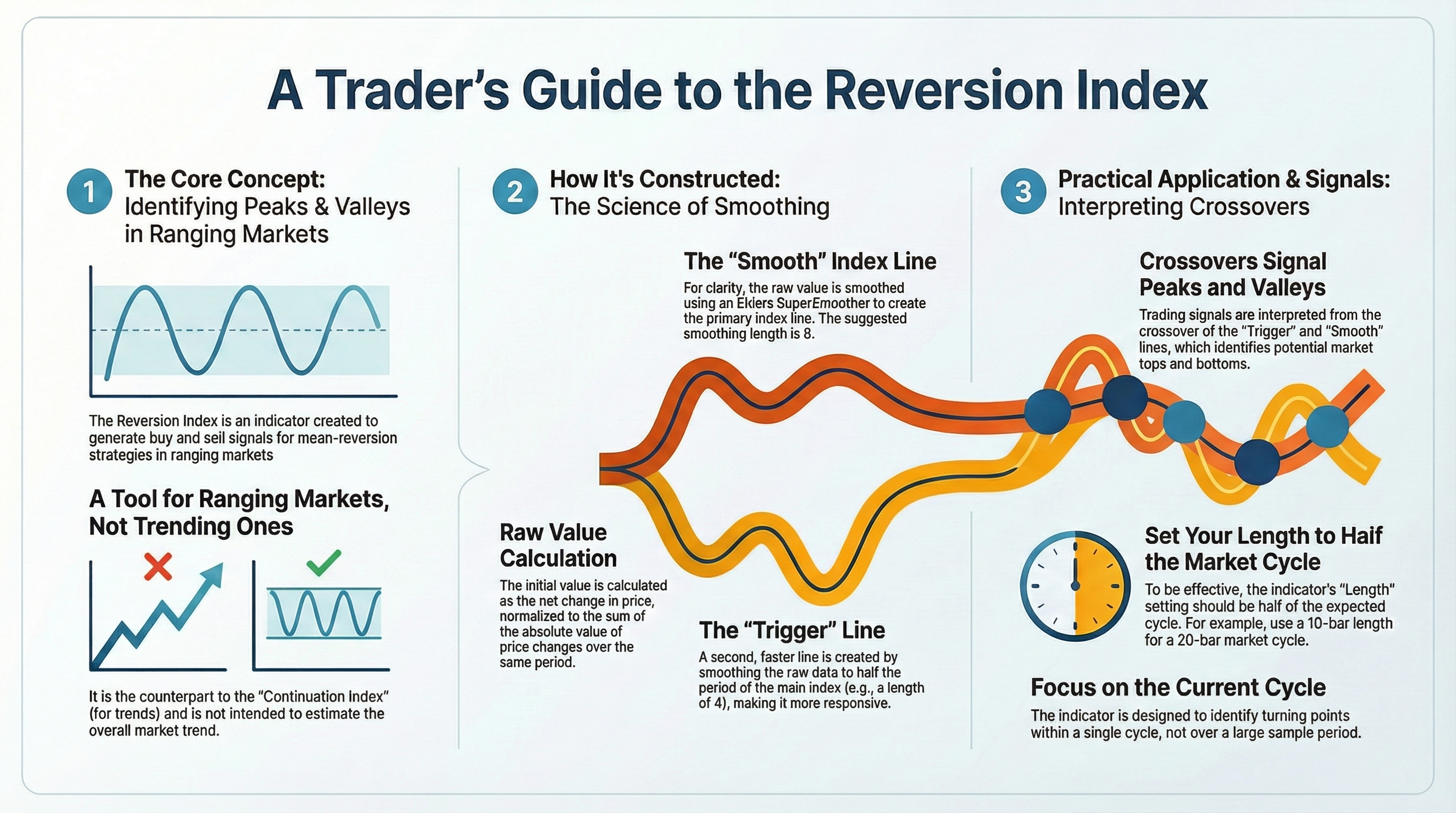 In John Ehlers’ article in this issue, “The Reversion Index,” he presents an indicator that produces timely buy and sell signals for mean-reversion strategies by summing bar-to-bar price changes and normalizing them by their absolute values. He explains that the summation should cover about half of the dominant cycle in the data, and that peaks and valleys are identified by the crossings of two SuperSmoother filters with different lengths. The reversion index is a normalized sum of price differences that oscillates between -1 and +1.