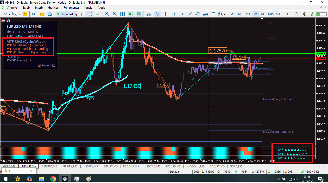 In the Atached Image, the Azimuth (Upper Left Box), indicates "Bearish" for M5, M15 and H1. While Oracle indicates Bullish for M5, M15 and H1.