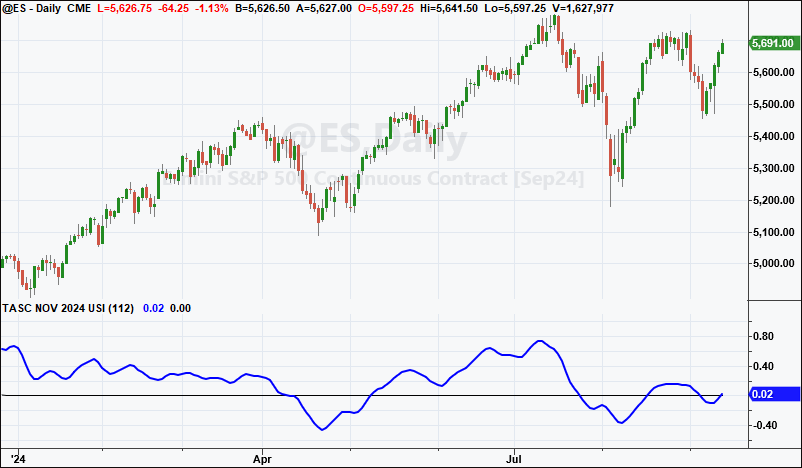 FIGURE 1: TRADESTATION. A daily chart of the emini S&P 500 continuous futures contract (ES) demonstrates the ultimate strength index indicator applied.