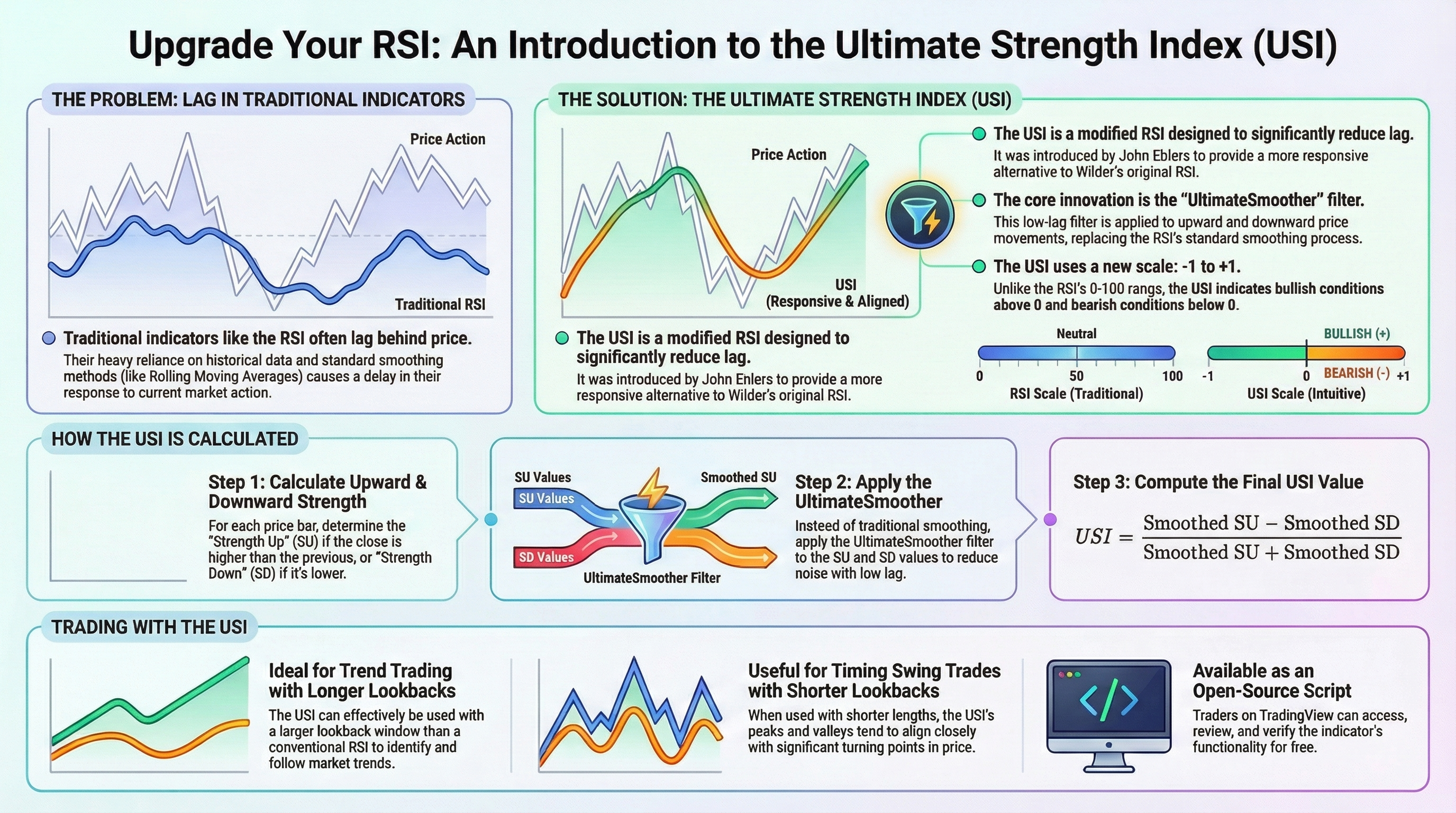 In “Ultimate Strength Index (USI)” in this issue, John Ehlers introduces an enhanced version of the RSI with significantly reduced lag. The USI retains many benefits of the traditional RSI, while providing faster, more responsive results. It highlights bullish and bearish conditions and allows for adjustments based on different data lengths, typically using more data than the standard RSI to achieve comparable outcomes.