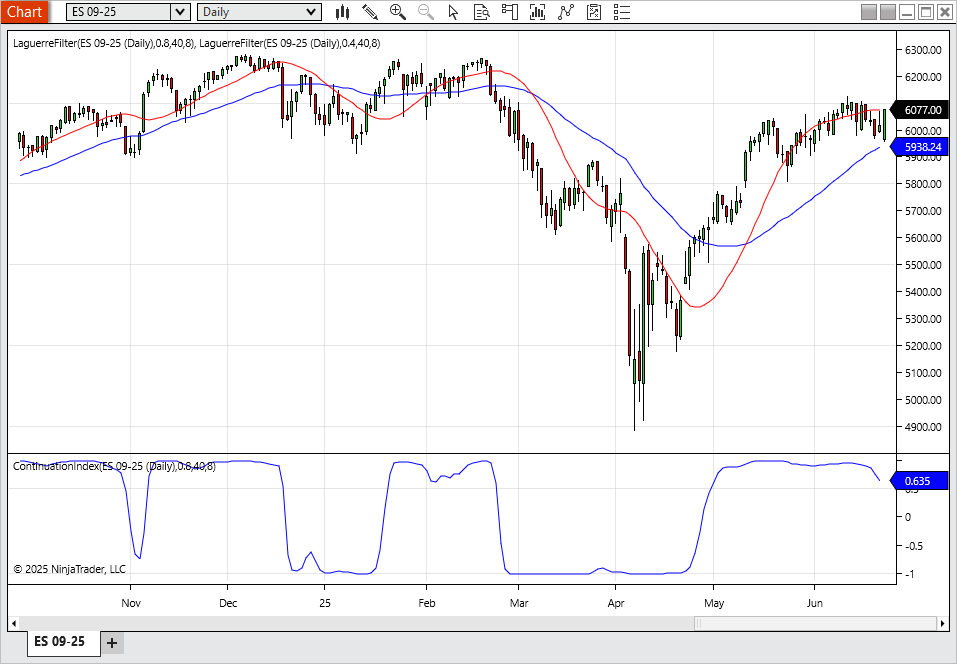 The idea for the Continuation Index was formed from an observation about Laguerre filters. In his article, Ehlers notes that when price is in trend, it tends to stay to one side of the filter. When considering smoothing, the UltimateSmoother was an obvious choice to reduce lag. With that in mind, The Continuation Index normalizes the difference between UltimateSmoother and the Laguerre filter to produce a two-state oscillator.