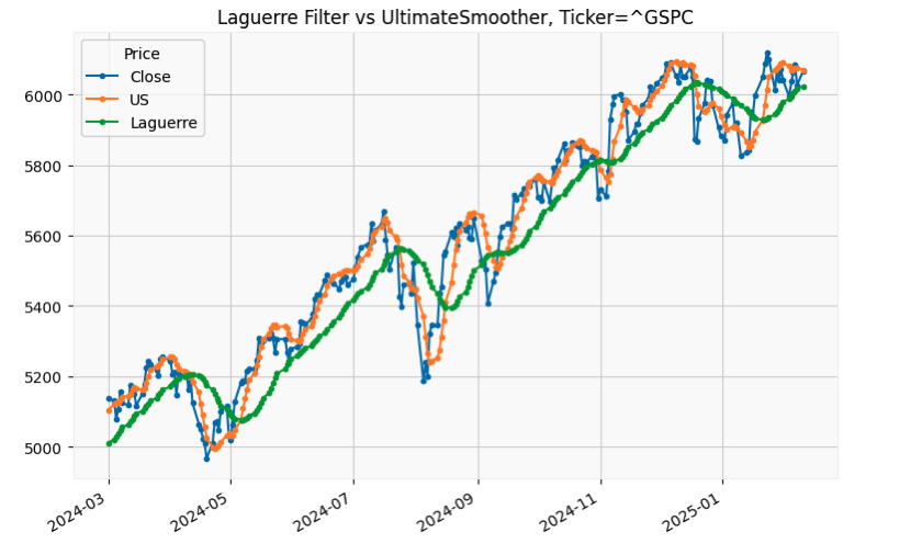 Figure 8 shows an example of the Laguerre filter and the UltimateSmoother overlaid on a chart of the S&P 500 index (GSPC). The indicator calculations used here are based on the length and gamma suggested in John Ehlers’ article in this issue. FIGURE 8: PYTHON. This shows an example of both the Laguerre filter and the UltimateSmoother, for comparison, overlaid on a chart of the S&P 500 stock index (GSPC). The indicator calculations used here are based on the length and gamma suggested in John Ehlers’ article in this issue.