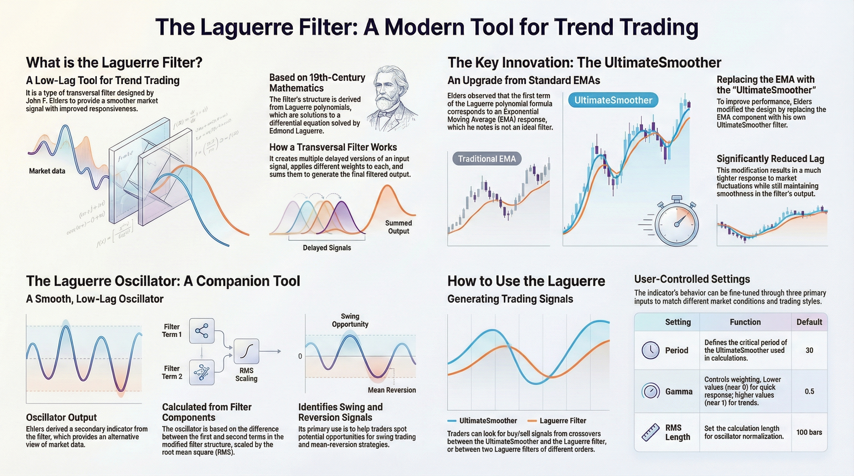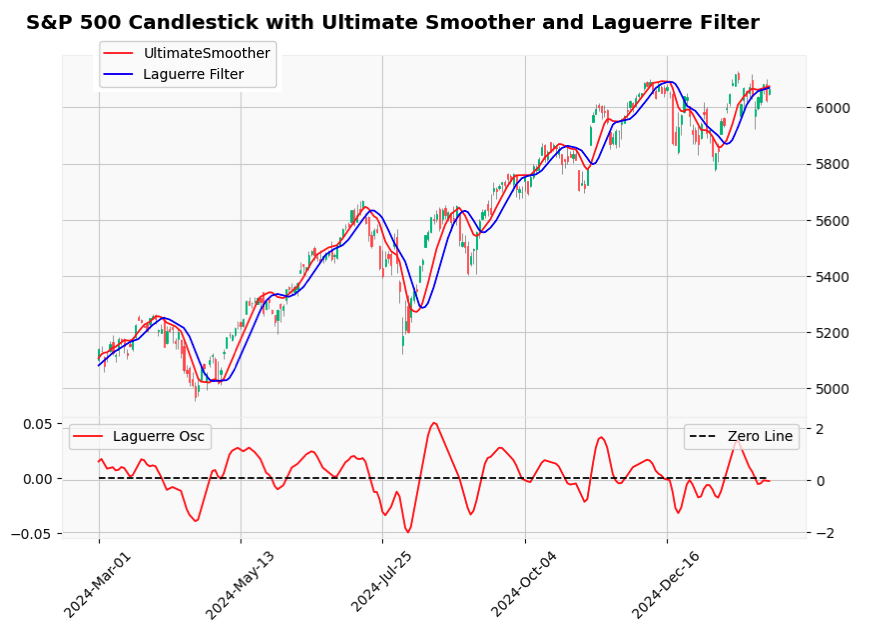 # Laguerre Filter and UltimateSmoother are overlaid on the price candles.
