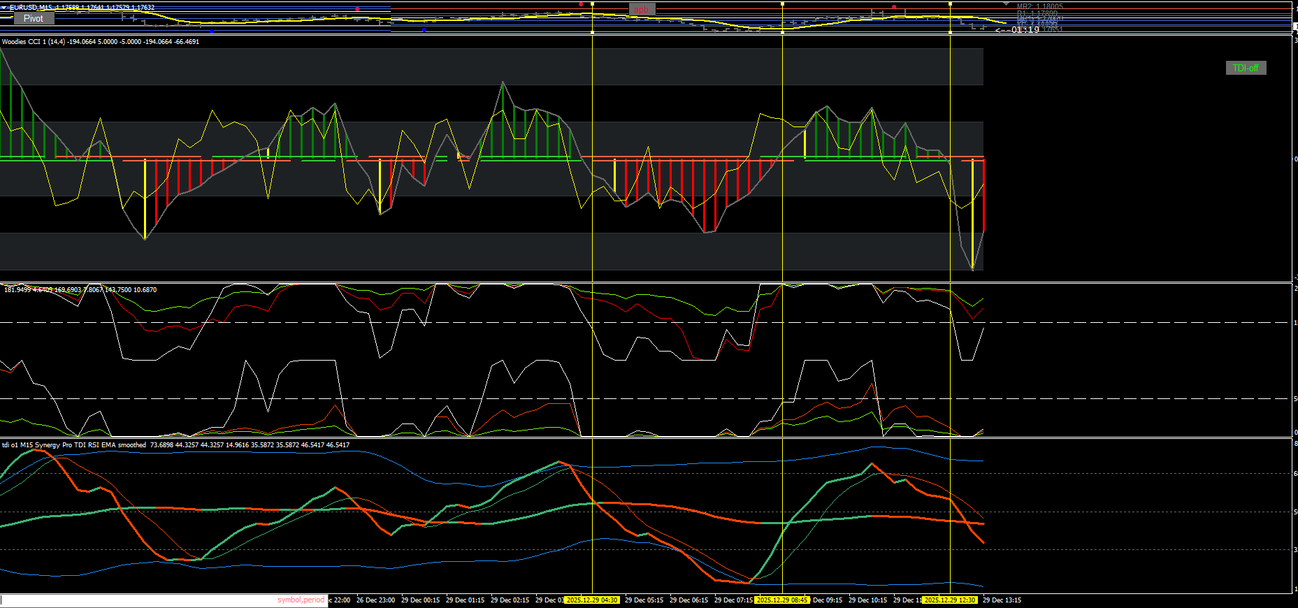 Here’s an older template I actively traded on the EURUSD 15-minute chart: CCI, Dragon, and TDI. And it worked.