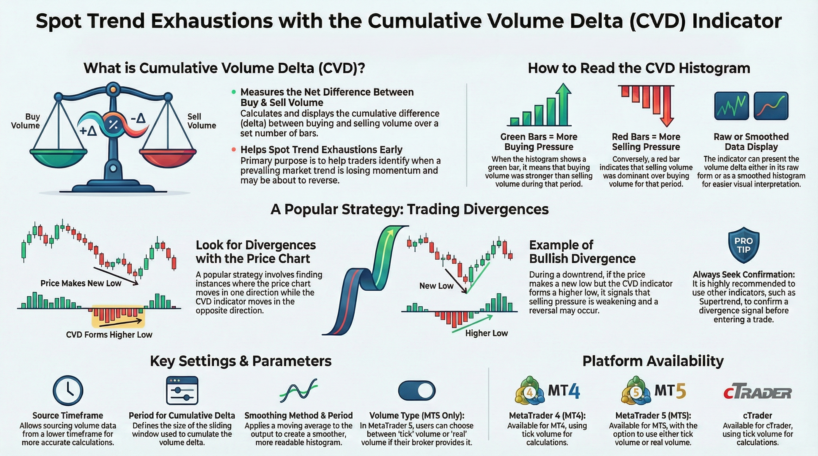 Although it would be a stretch to call this CVD indicator a multi-timeframe one, it can draw buy/sell volume data from lower timeframes (which is a more accurate way to calculate Cumulative Volume Delta). This isn't always practical due to lower timeframe data availability issues. If you attach this indicator to a higher timeframe and select a very low source timeframe for volume data, it might not display anything useful. In that case, it is recommended to increase the source timeframe.