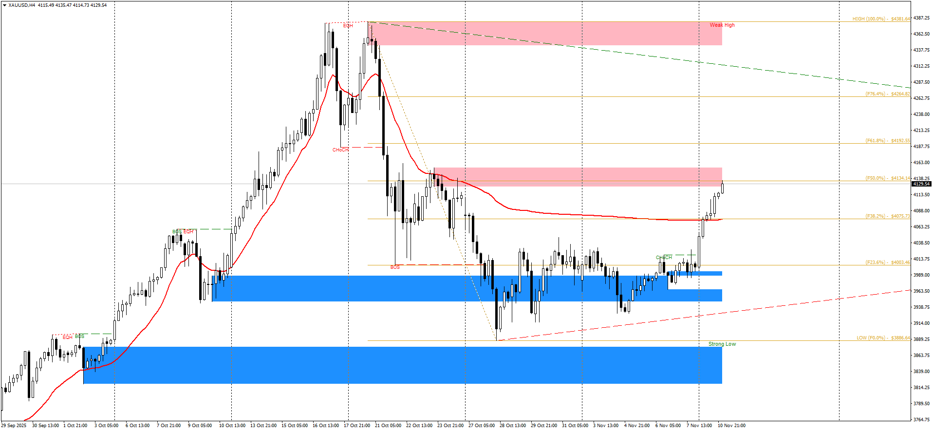 ▪️This analysis is based on the Elliott Wave Theory on the 4-hour timeframe, showing a corrective W–X–Y structure after completing Wave (3) at the 4381$ high.