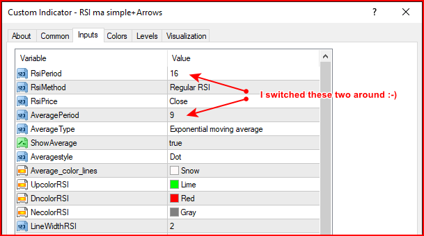 Yes it was. I switched the values of the RSI and MA in the options. See attached screenshot