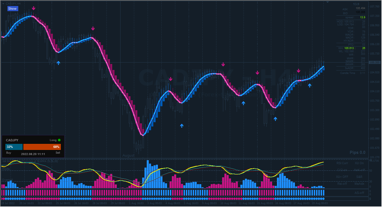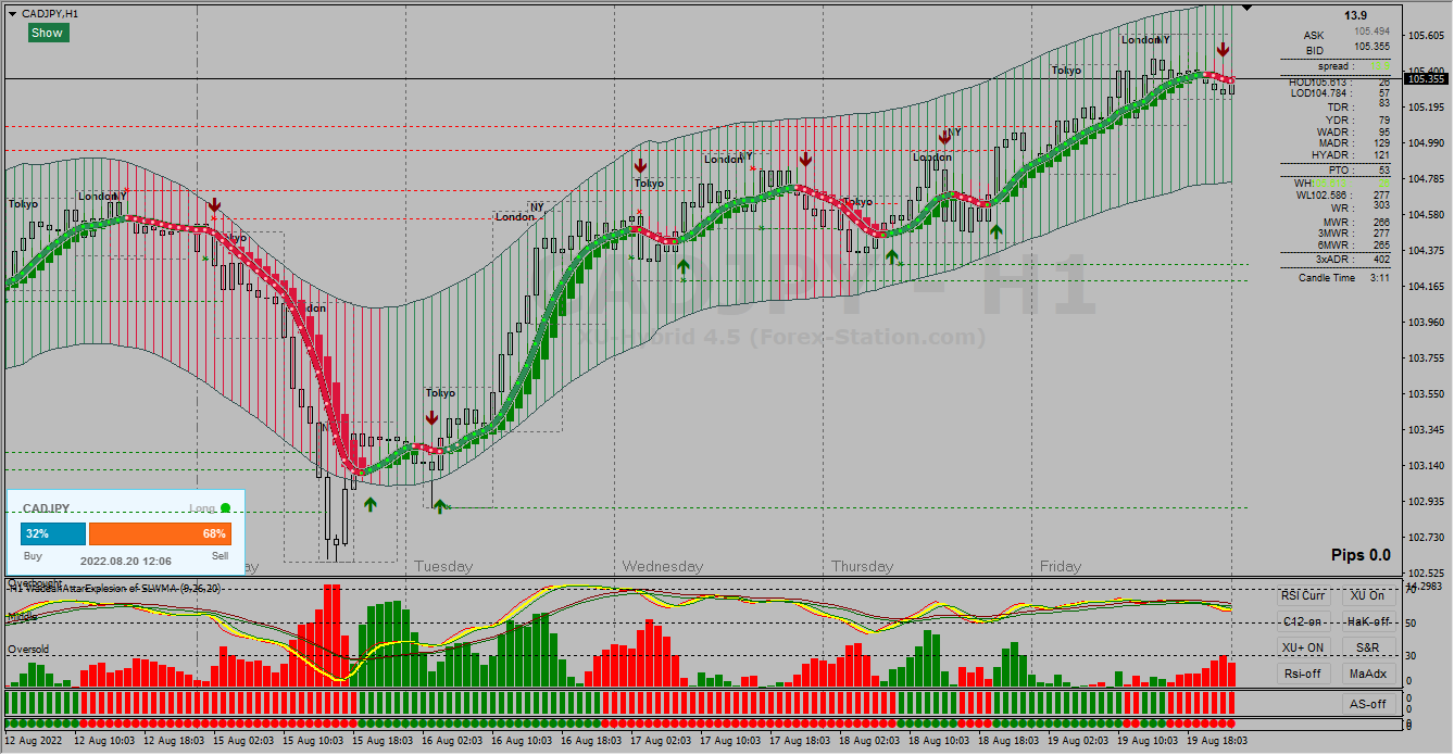 XU+TMA Mod) and his latest creation, the MA+ADX indicator. In addition, I've added the FreeRSI indicator which (in my opinion) does a better job than the previously included Elegant Oscillator