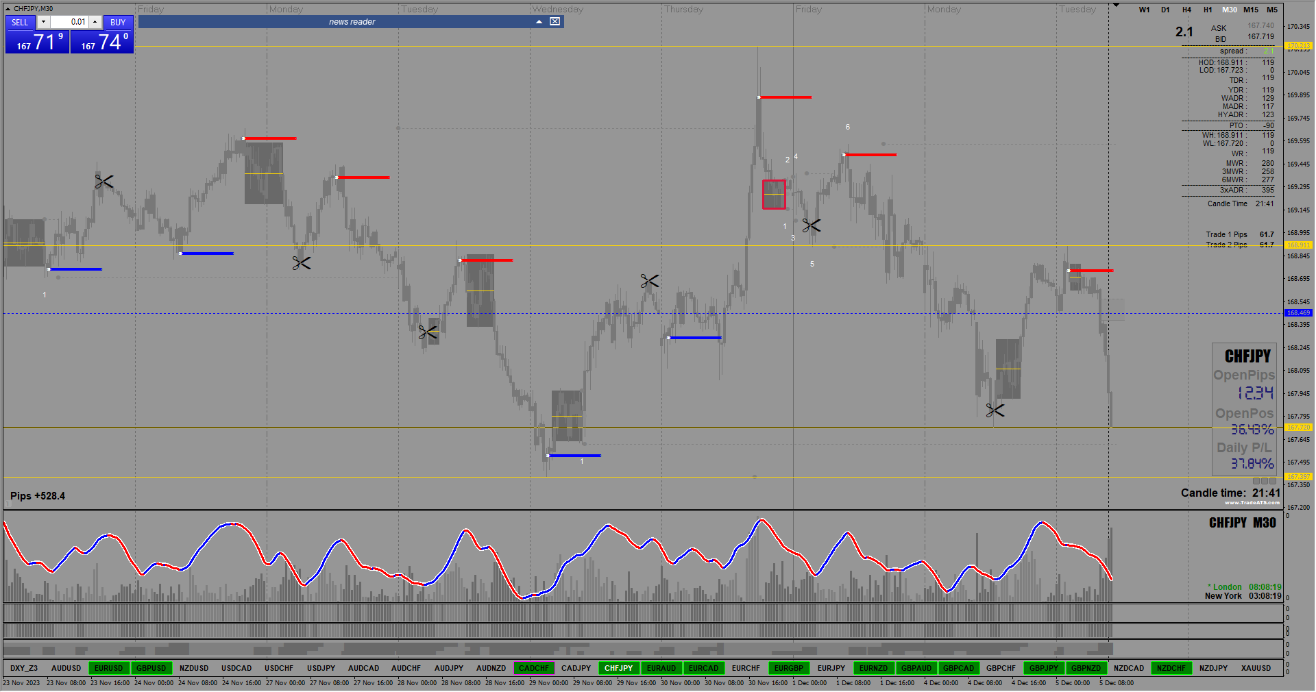 I would have waited until the day closed before considering placing a trade (of course checking for alignment). Currently, you can see that is is No alignment of ALL the sub-window indicators. So it is a much riskier trade for the Daily timeframe!Boluwatife06 wrote: Tue Dec 05, 2023 10:47 pm Hello Boss, thanks for this wonderful system. Please is this a good sell on GU daily chart