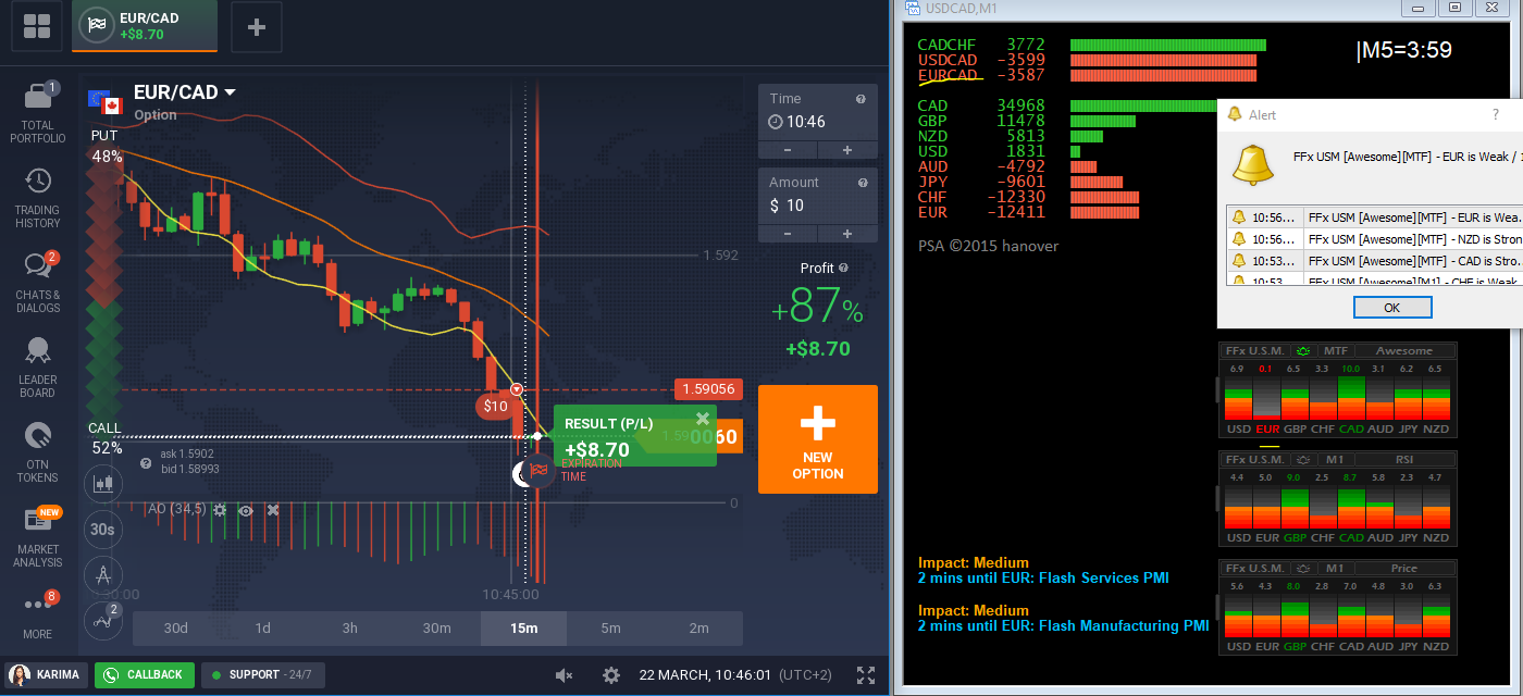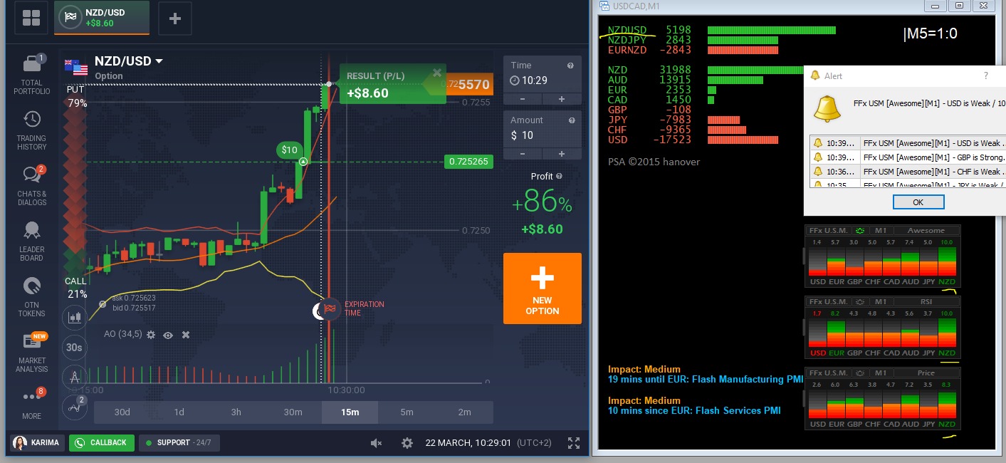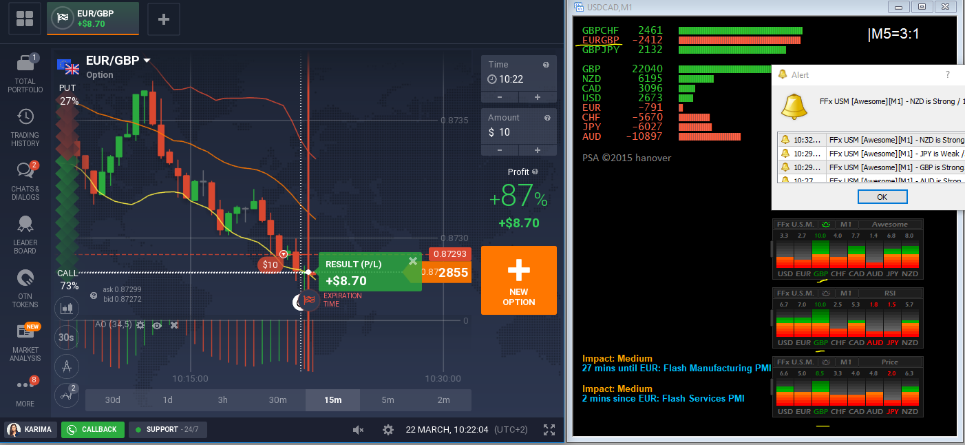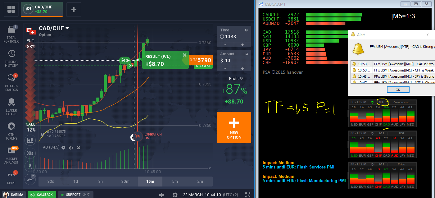 And if I understood you correctly you go into a 1 minute call as soon as you get an alert if a FFx currency is at 10 or 1 minute put if it alerts 0?