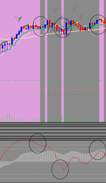 I am using HaosVisual averages.ex4 and ran into something I'm unsure about. I highlighted everywhere on the chart (in clrPlum) where the fast value was > 30 or < -30: