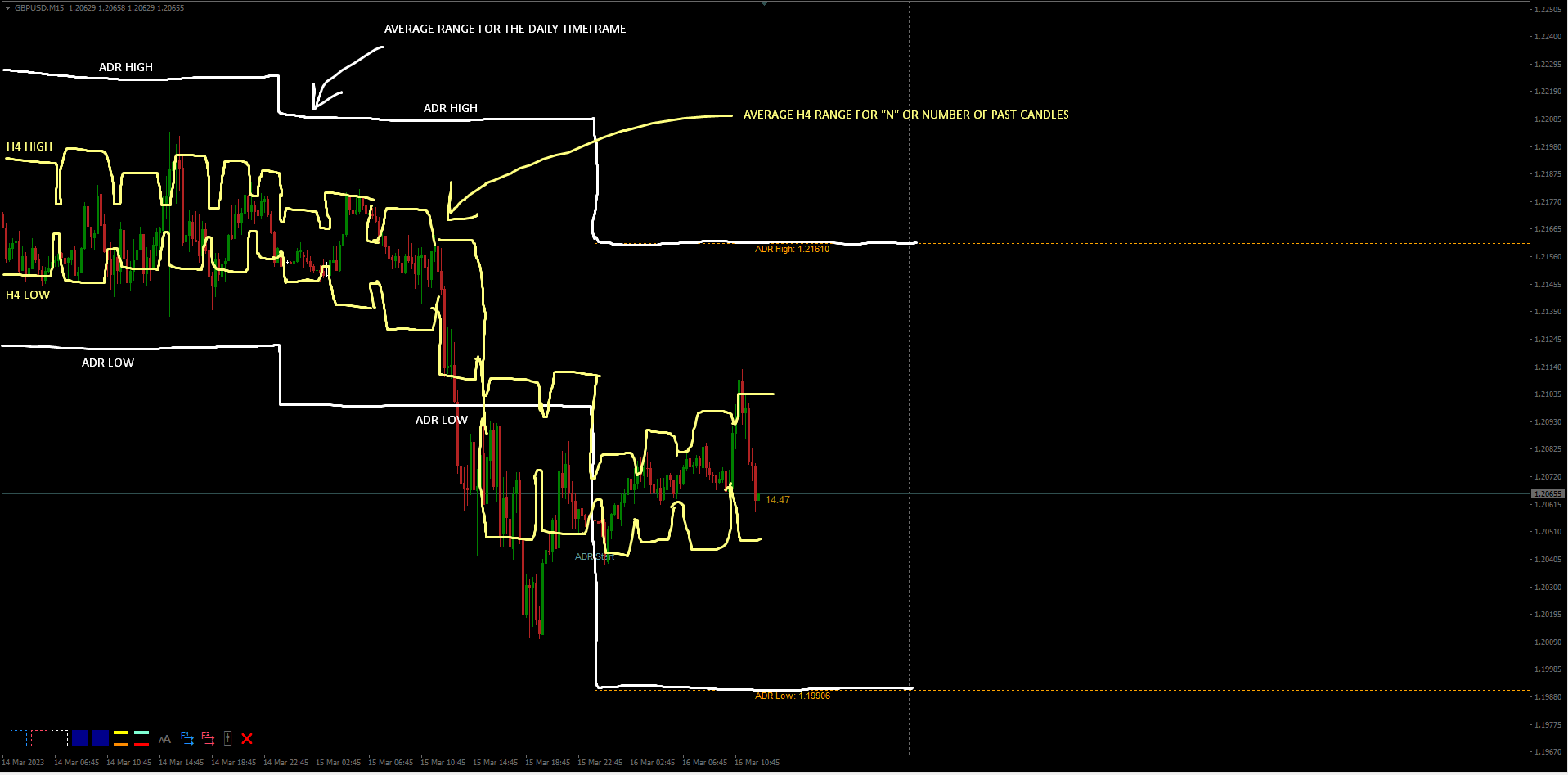 Basically an ADR but instead of daily range, an average hourly range with H4 and H1 average high/low lines for "n" or a number of previous candles.