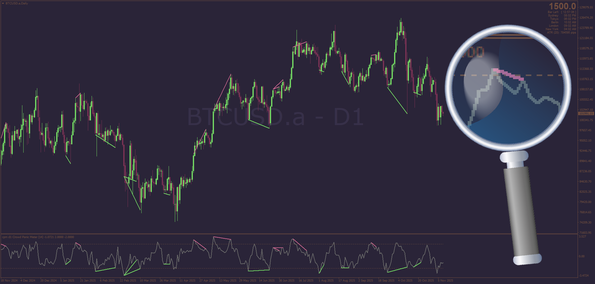 This indicator is called the Crowd Panic Meter. It utilizes the Z-Score in it's calculations & is designed to give accurate reversal signals according to the "crowd's" emotions. Mrtools has now added Divergences to this code for extra confirmation. D/L: post1295575690.html#p1295575690