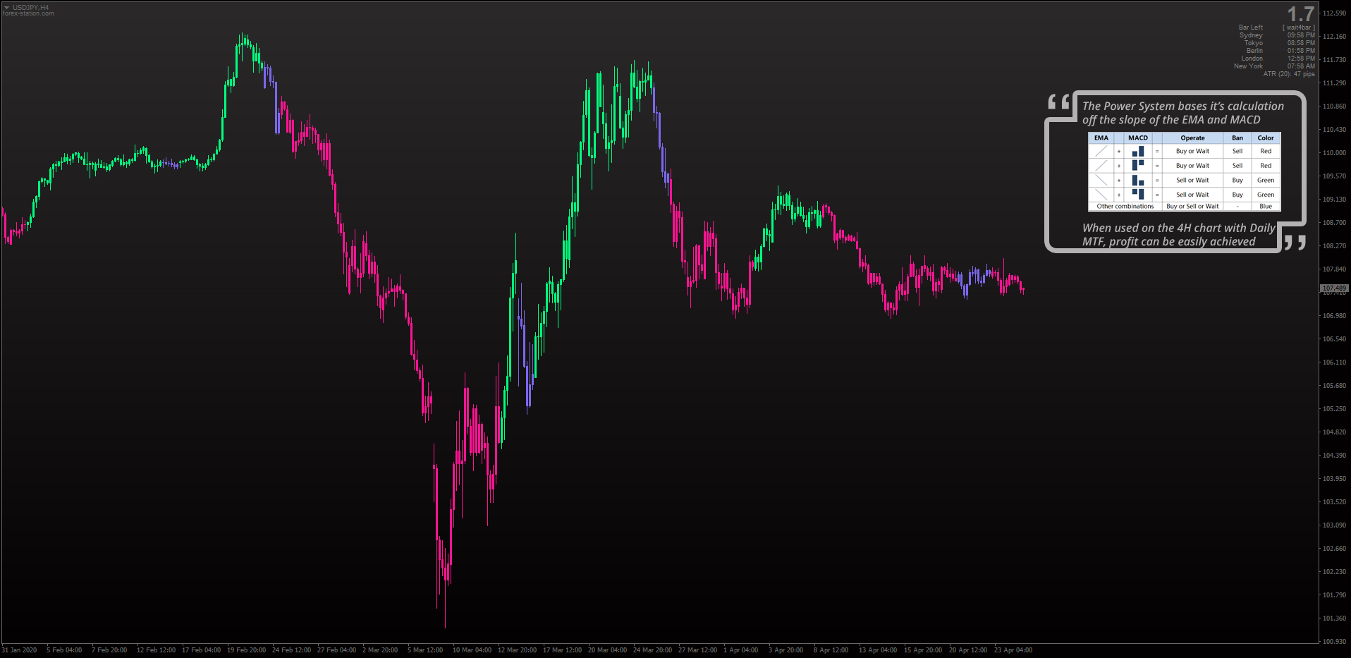 The Power System is based off Alexander Elder's Impulse System which incorporates the EMA and MACD to create a winning strategy. Thanks to great coders like Mrtools, this system is available as a non-repainting code with MTF & can be downloaded here: viewtopic.php?p=1295408953#p1295408953