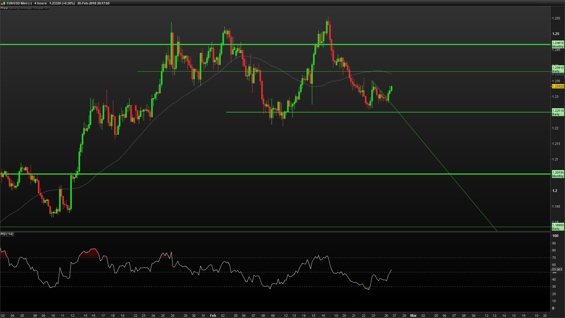185I honestly don't know what to think in this situation. On one hand it appears quite bearish, but there's also a real possibility to rebound from 1.2200.FrancoisT wrote: Thu Mar 01, 2018 12:19 am EUR/USD - Sitting just above 1.2200/10 support. A kind of inside bar formation (1H chart) with face breakout from the top - it is a sign for further decline with very first targets around 1.2160.