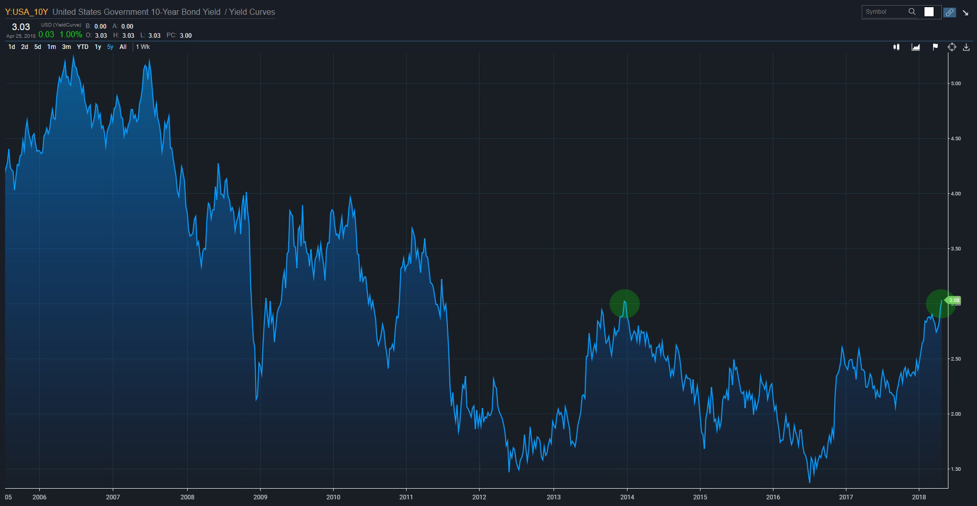 217Yup spot on bro. Keep an eye on US 10 year treasury yields which has broken 3% for the first time since 2014 (as marked below). As it continues past that 3% level naturally US dollar will continue to follow yields to the upside and Euro will slide even further.mlawson71 wrote: Thu Apr 26, 2018 12:56 am The pair is very, very bearish, I think it may fall below 1.2100 in the coming days.