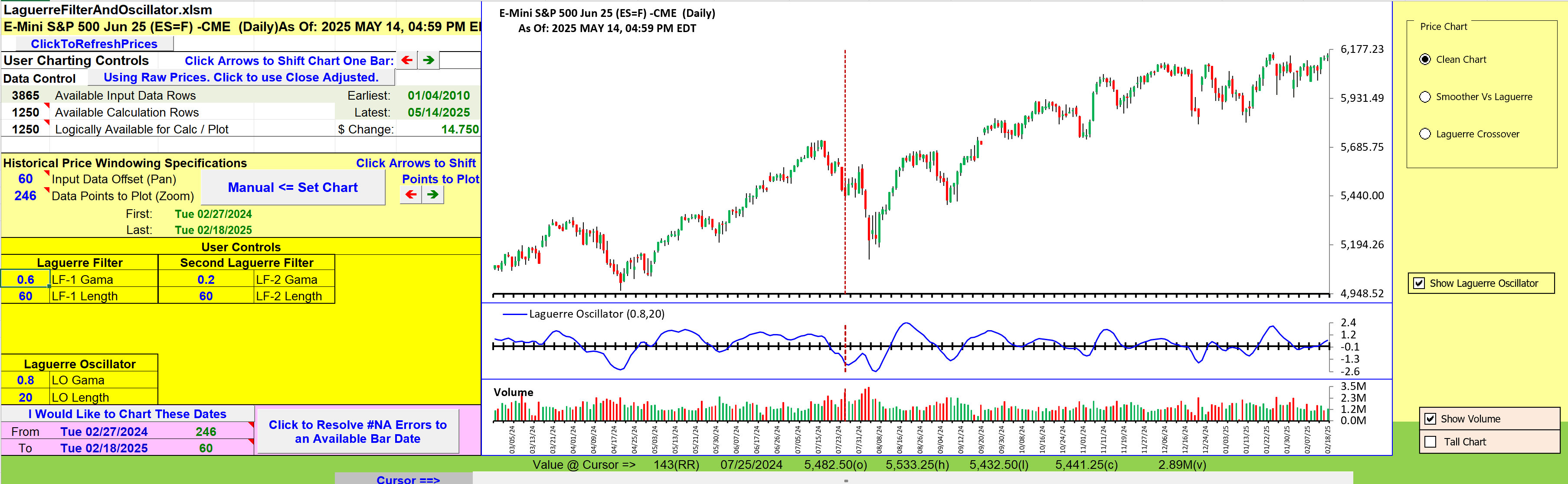 See Figure 10 for an example of the cybernetic oscillator plotted on a daily chart of the emini S&P 500 futures contract (ES), similar to Figure 4 in Ehlers’ article in this issue.