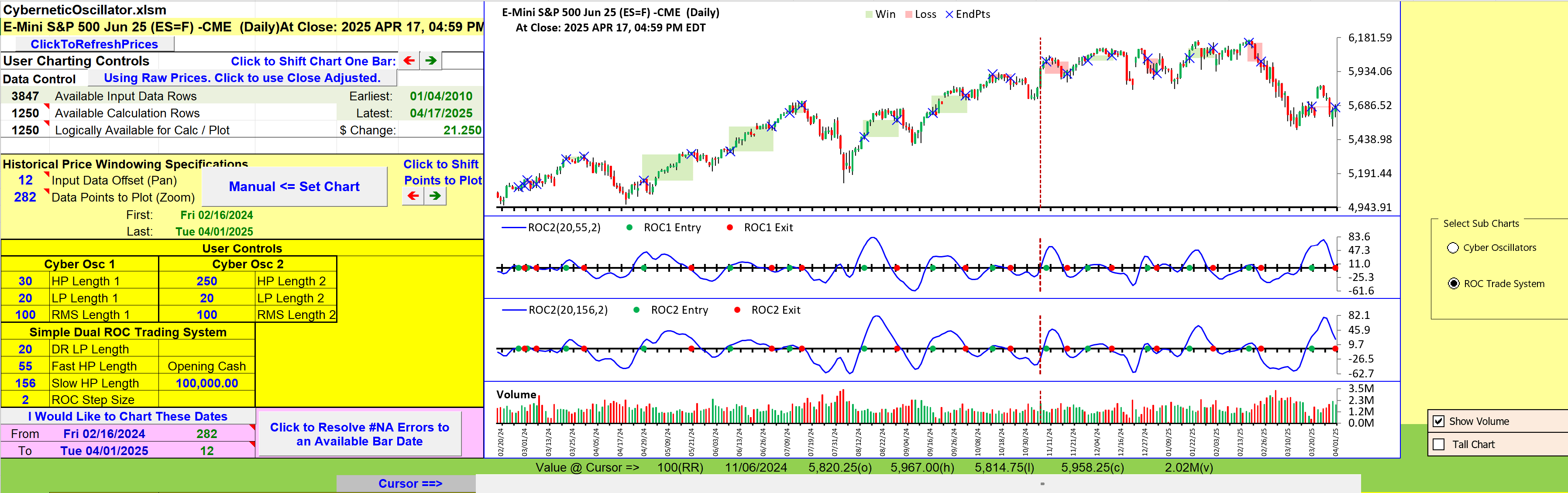 In the article, Ehlers also provides a simple trading strategy to demonstrate using the oscillator. The trading system is built by comparing the rate of change (ROC) of two cybernetic oscillators with slightly different band specifications. In Figure 11 I show an example of recent trades based on this strategy. The lower charts in Figure 2 track the individual ROC values. When both ROC values go positive, it produces a buy signal and when either ROC value goes negative, it produces a sell signal. The green and red dots mark when these conditions are true. The green and red shading highlight the price bars involved in trades. Scrolling the CalculationsAndChart tab right to column Z (Figure 12) reveals the calculations to trade using this dual ROC strategy. As noted in the summary block, calculations in this spreadsheet cover almost five years, enough to demonstrate the simple strategy.