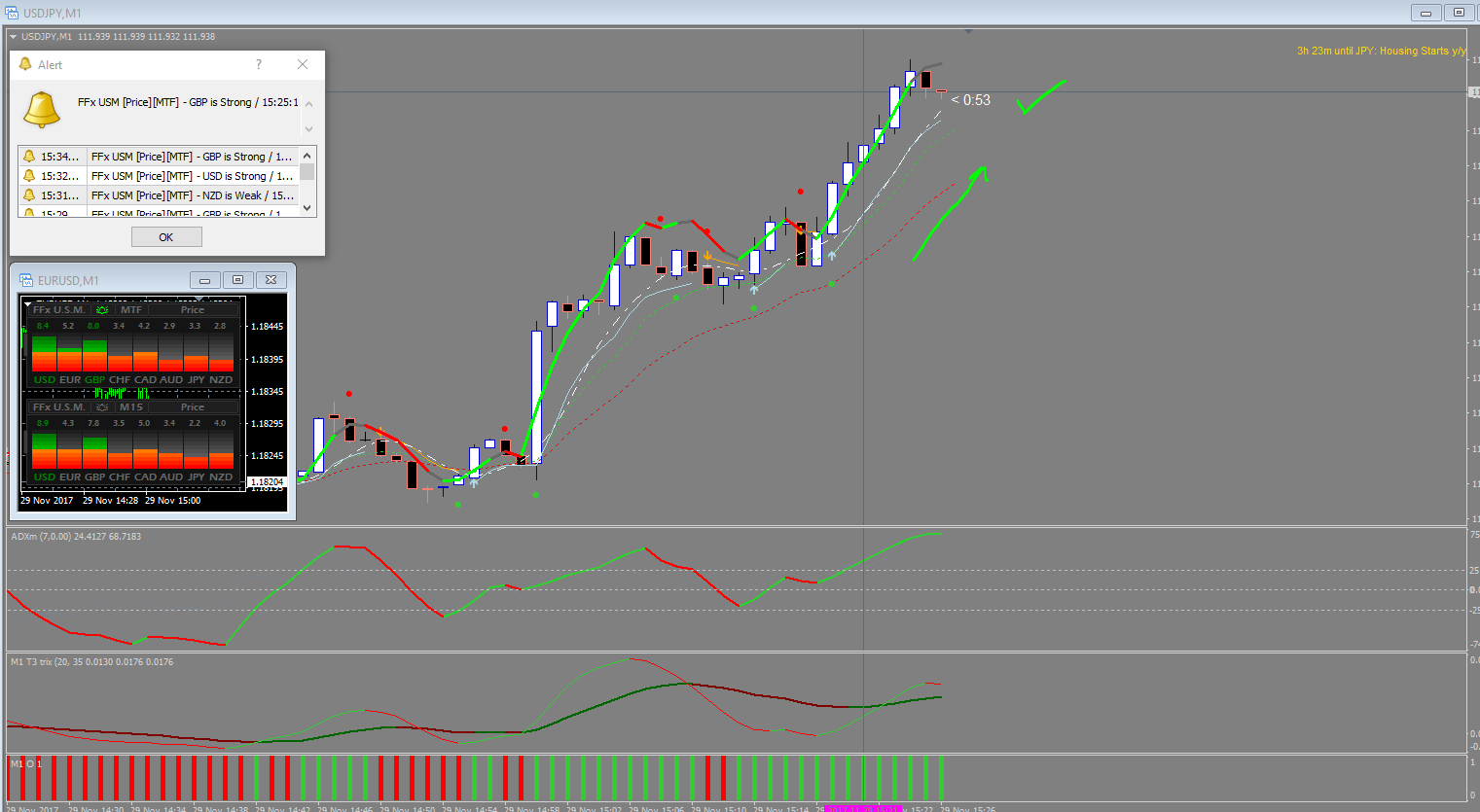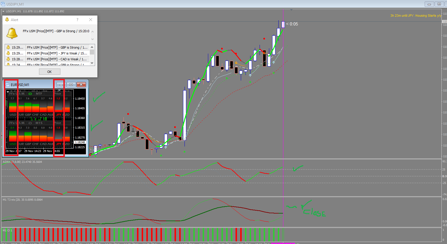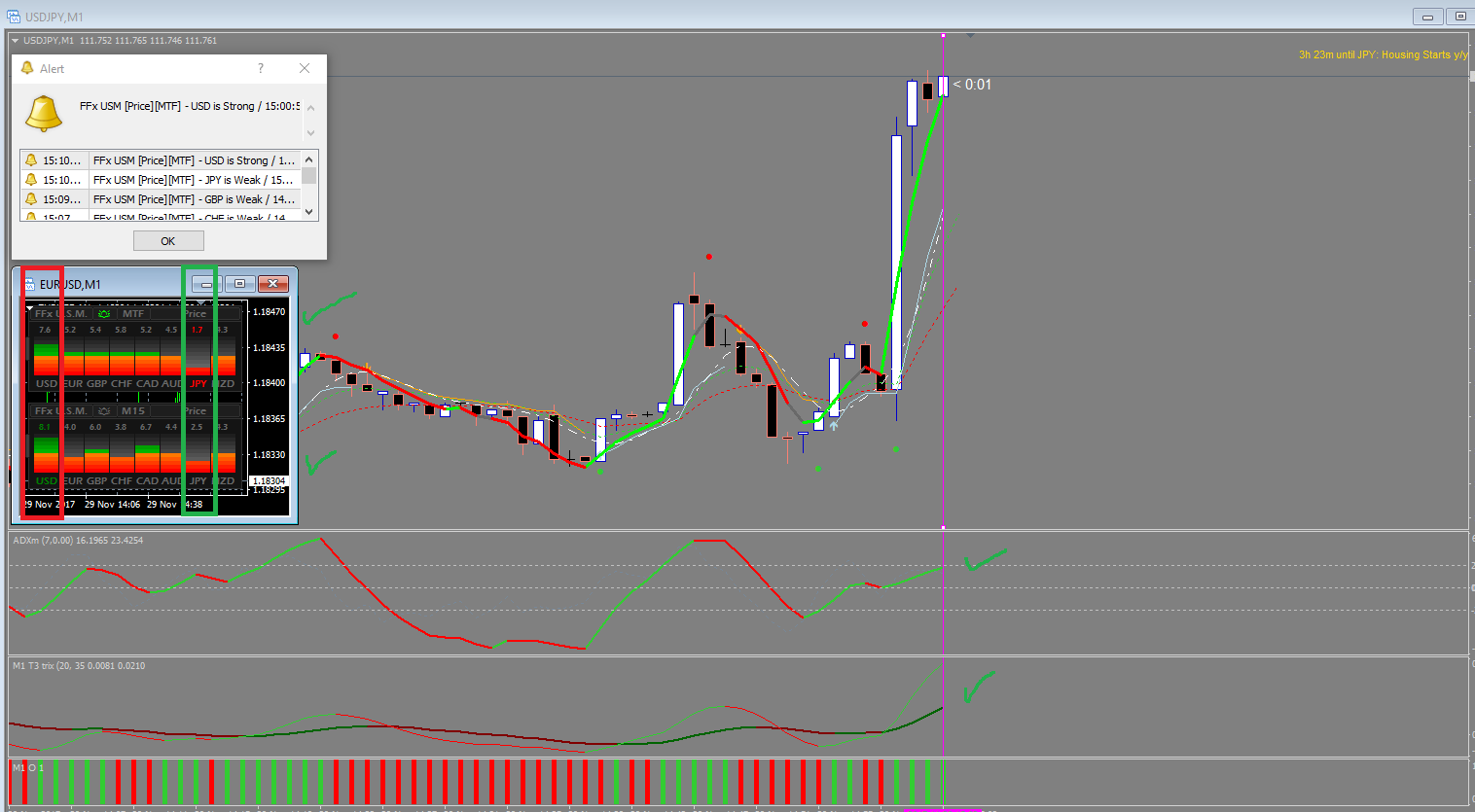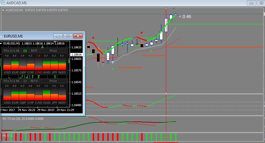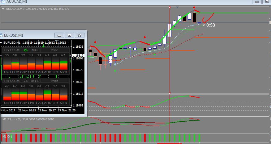 I use it in combination with a T3 indicator and an ADX indicator. I have to sets of ffx meters(1 set to mtf of M1 and M5 - this is my signaling indicator and the other set to M15). Both set on price.