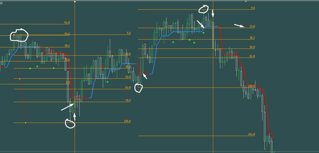 if the blue line history & red line history (sure it will not repaint) & for setting fib is highlow where the the HALF TREND history colour not in current