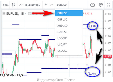 The indicator works only on liquid major currency pairs listed in the drop-down list of the TradingView chart window. The percent numbers located near the levels indicate the total volume fraction of the 7 maximum stop loss zones. In the example shown in the figure, the resistance zone contains 1.8% of all stops of the Seller, and support - 1.99% of stops of the Buyers.