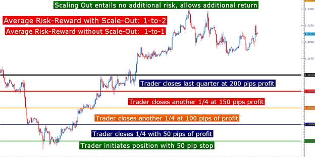 If they decide to use a 1-to-1 risk-to-reward ratio, the trader is likely looking at one of two outcomes: Either a 50 pip stop, or a 50 pip limit. But let’s look at this same situation from the vantage point of the trader that wants to scale out of their position: If the market moves in their direction 50 pips, they can look to ‘scale out’ of ¼ of the position, and then they can move their stop to break-even; so worst case scenario, of price reverses against them - they are out of the remaining ¾ of the trade at no gain, and no loss.