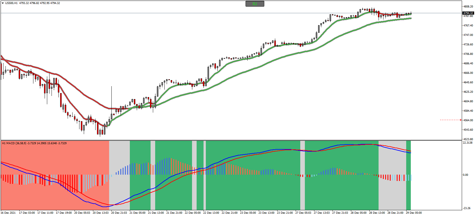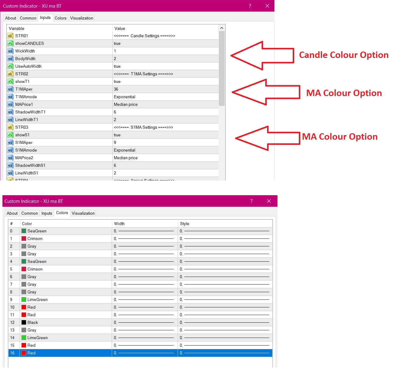 Fully clickable, with options for show-hide candles, trend ma, signal ma.