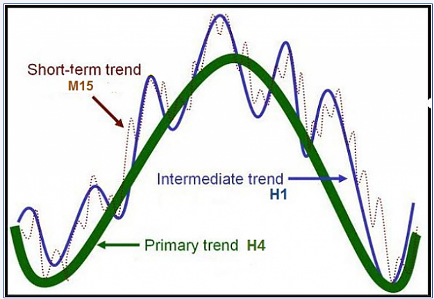 and take a look at the picture, I am using 9,36,144 moving averages, which are equivalent of M15: 9, H1: 9, H4: 9, isn't this what you are looking for? (of course it's for 3 timeframes as per your picture, not 4 timeframes)