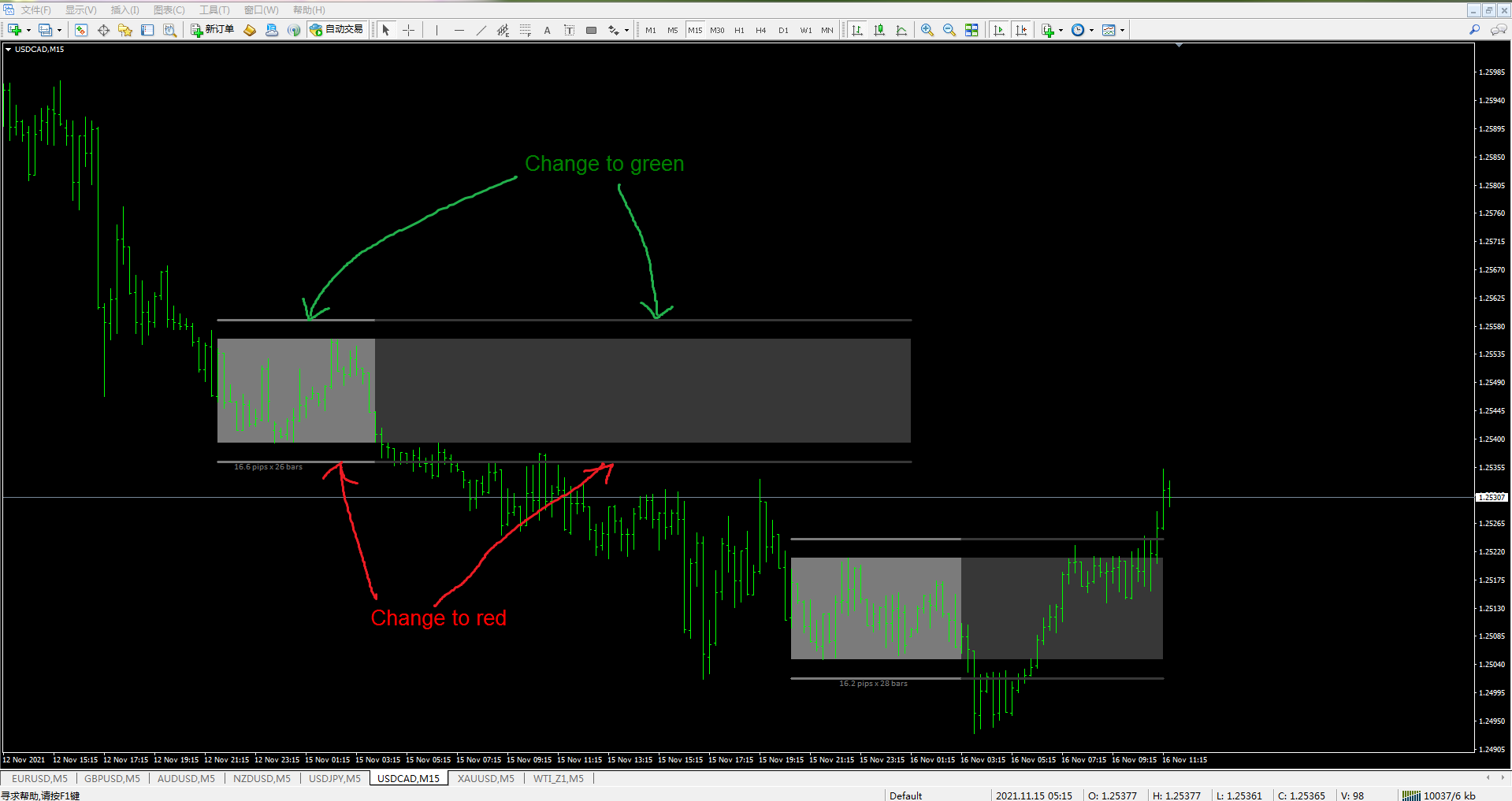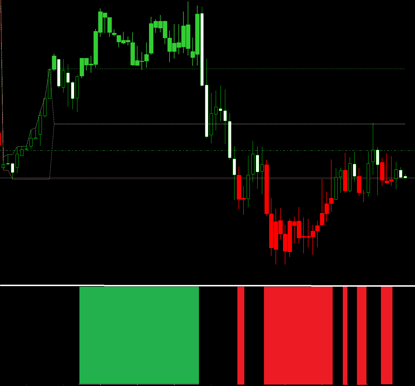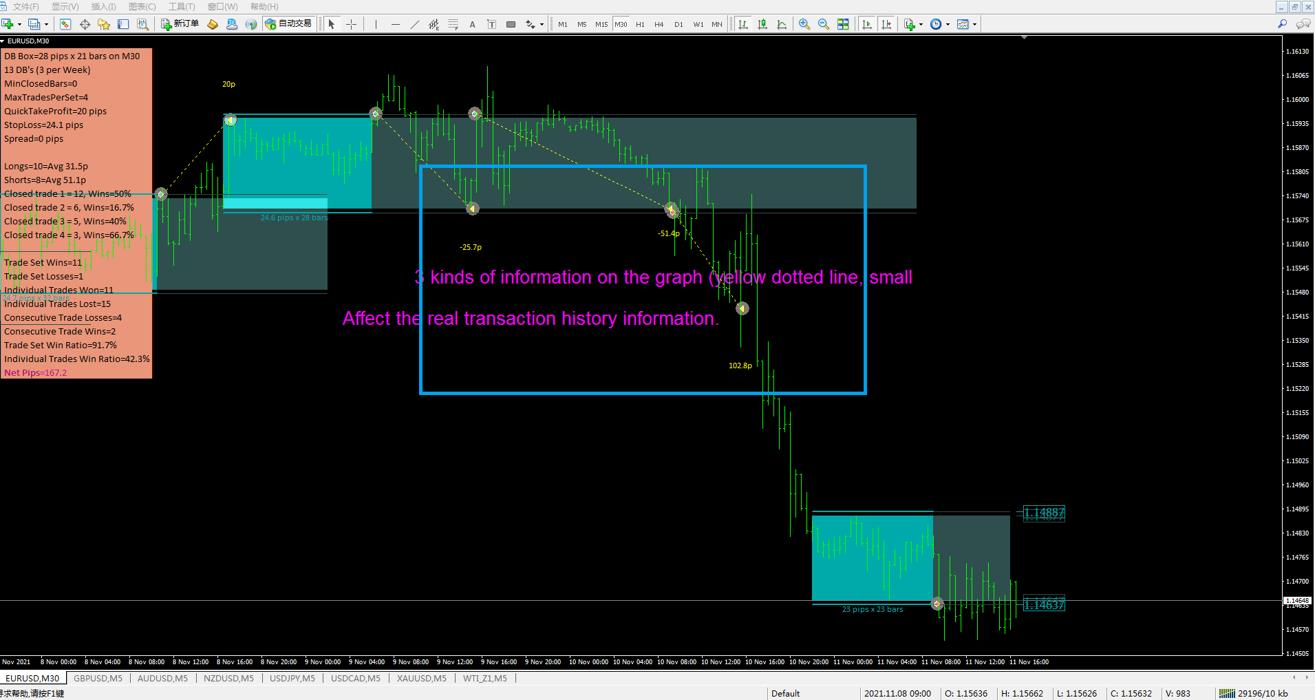 The three types of information on the chart (yellow dotted line, small arrow, 102.8p) affect the real transaction history information.