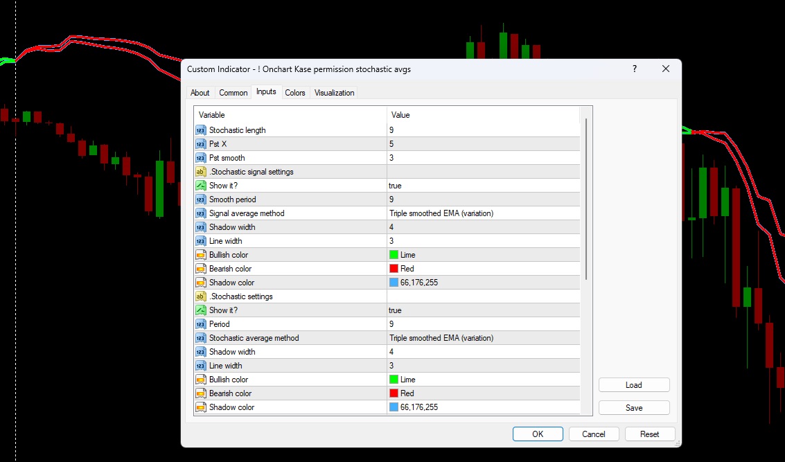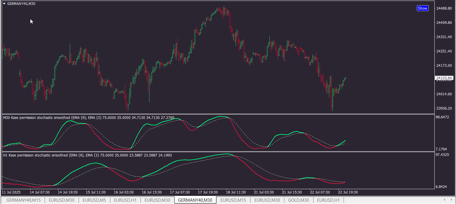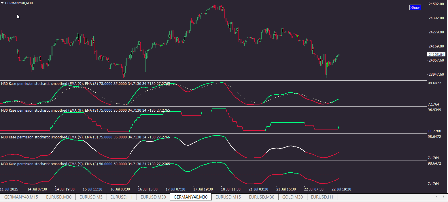 For the subwindow (oscillator) version please see here: Kase Permission Stochastic (subwindow) for MT4.