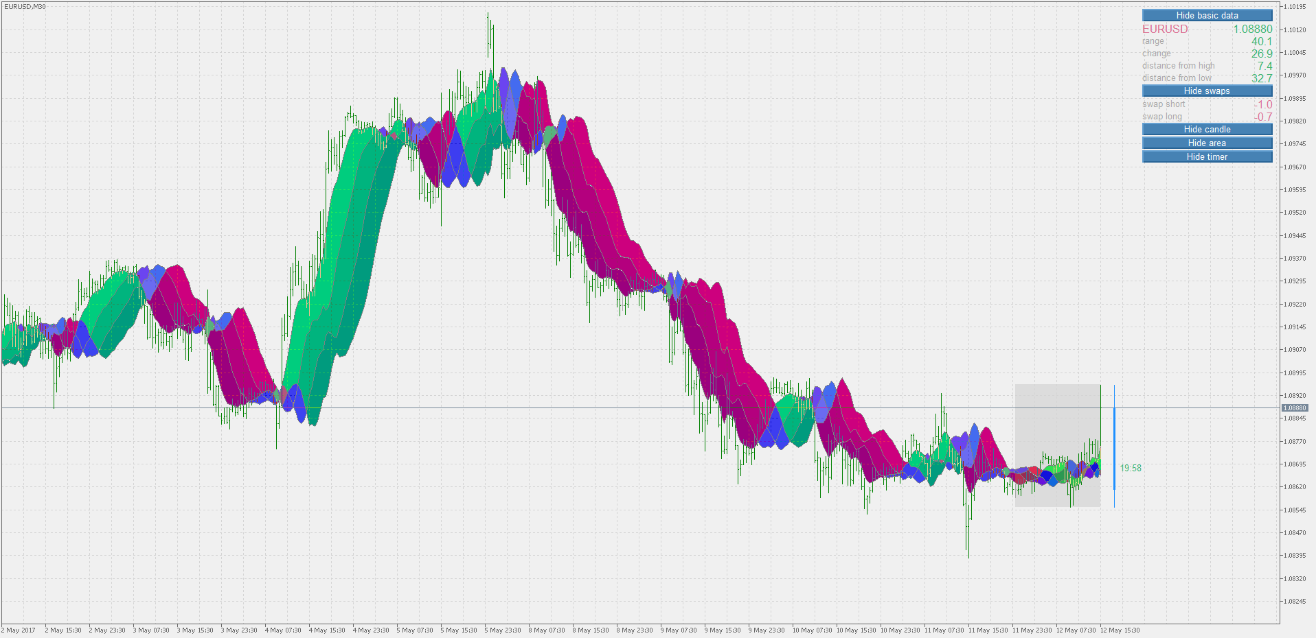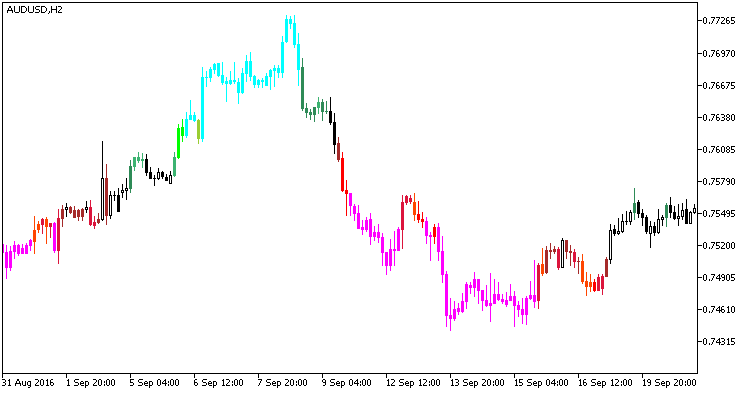 The indicator is based on five symmetric Keltner channels with different values ​​of the input deviation parameters. Breakdown of the channel with a large deviation value leads to a more bright coloring of the candle. For a growing market, shades of green and green flowers are used, and for falling red-pink-brown.