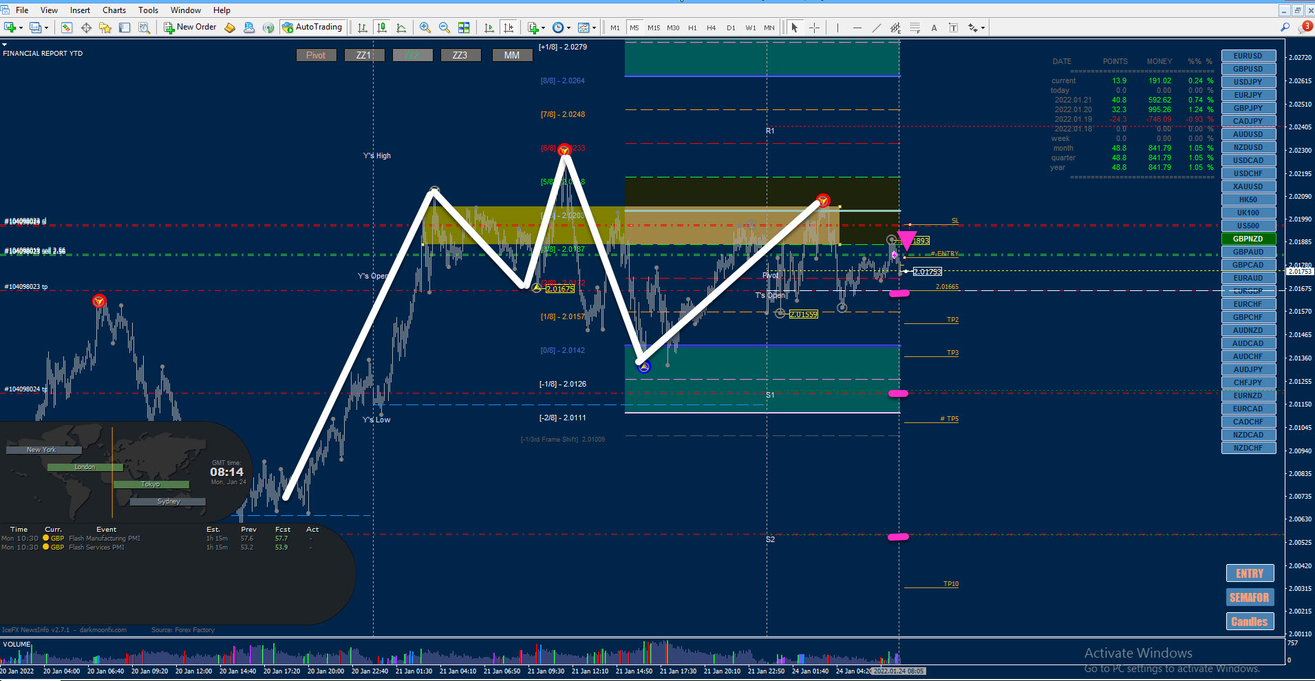 24.01 GBPNZD M5 JUST IF IT GETS BELLOW the daily open line there it is a chance to keep following to S1, OTHERWISE we are still on an uptrend. If this shift does not happen considering the risk-reward ratio it is worth taking this trade anyway. Price seems to be rejected constantly on 4/8 MM so I feel quite justified taking this SELL trade as a possible shift in trend
