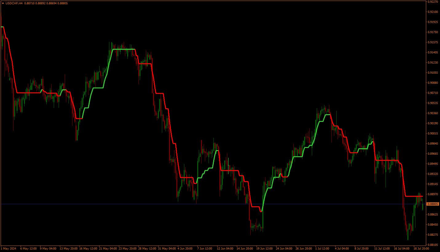 Indicator plots envelopes or adjustable high/low channel displayed as trend stops.