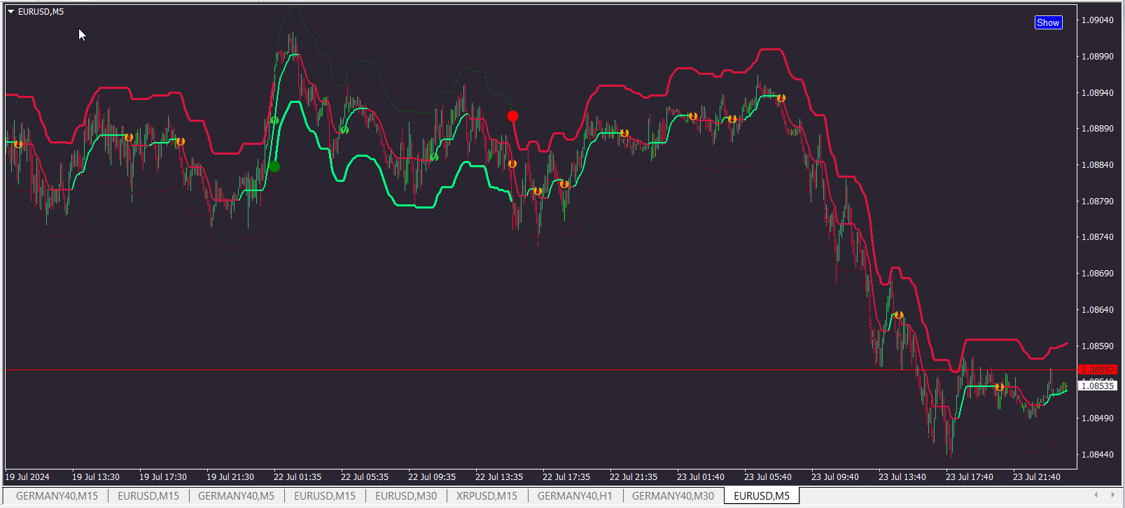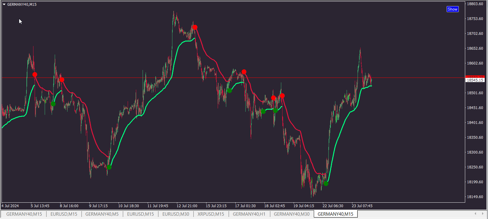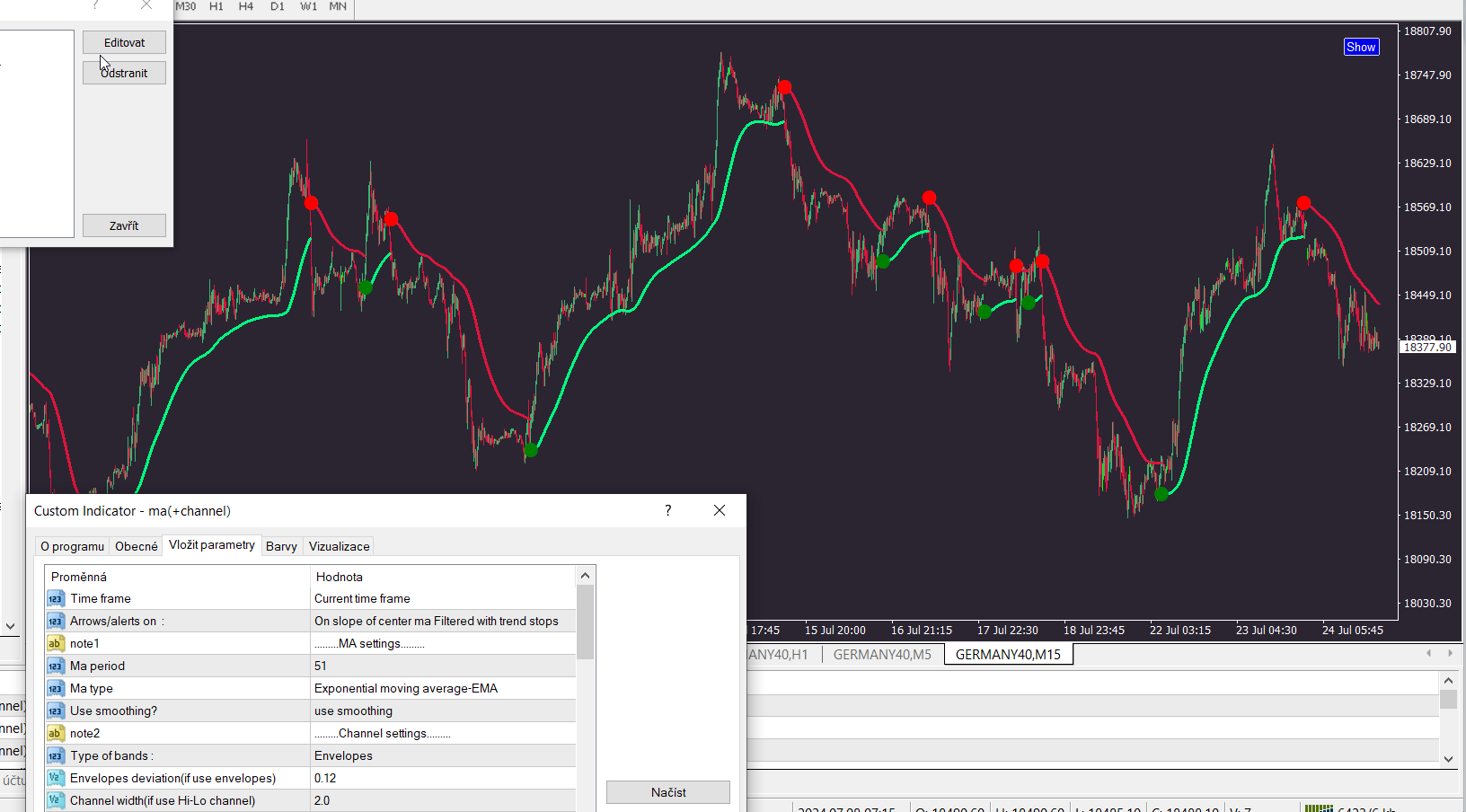 Also arrows/alerts is in slope of center MA, trend dots or combination of slope filtered with trend dots.