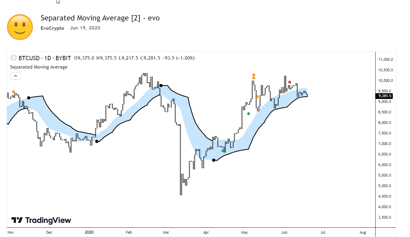Here is another TV conversion, little enhanced and based on the Separated Moving Average by EvoCrypto and plots a trend biased (SuperTrend type) display from two moving averages: