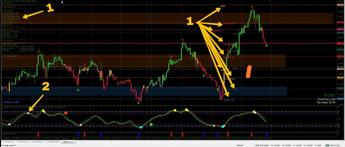 First one, for indicator "Auto_Fib_Pivots nmc". Could you please add change font size option and change color option for the comments and labels (No. 1 in the picture)?